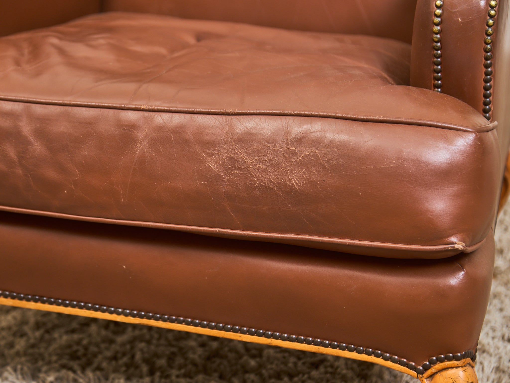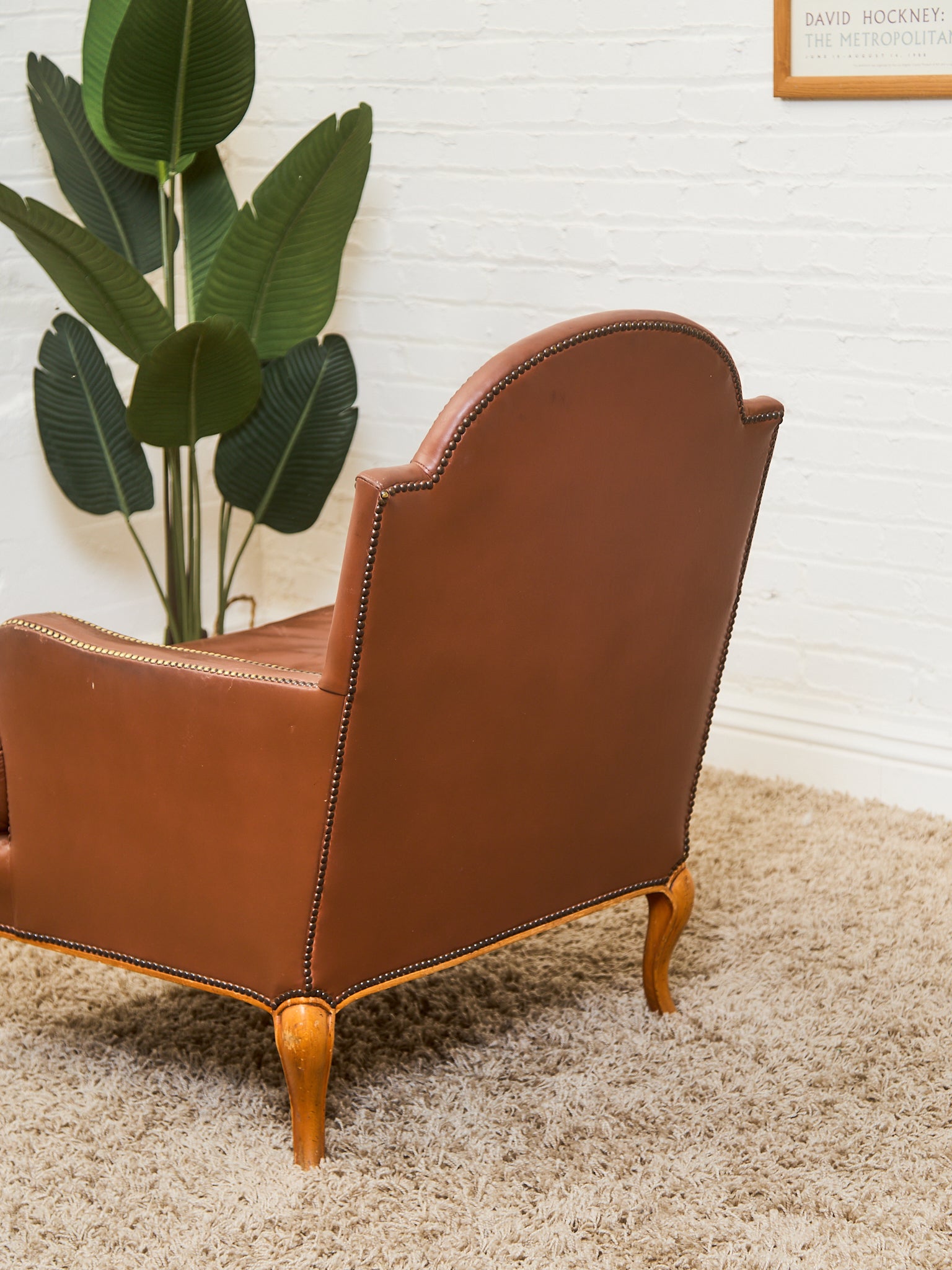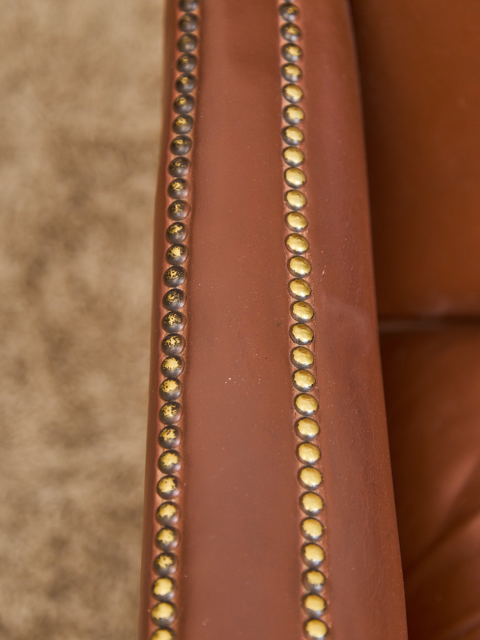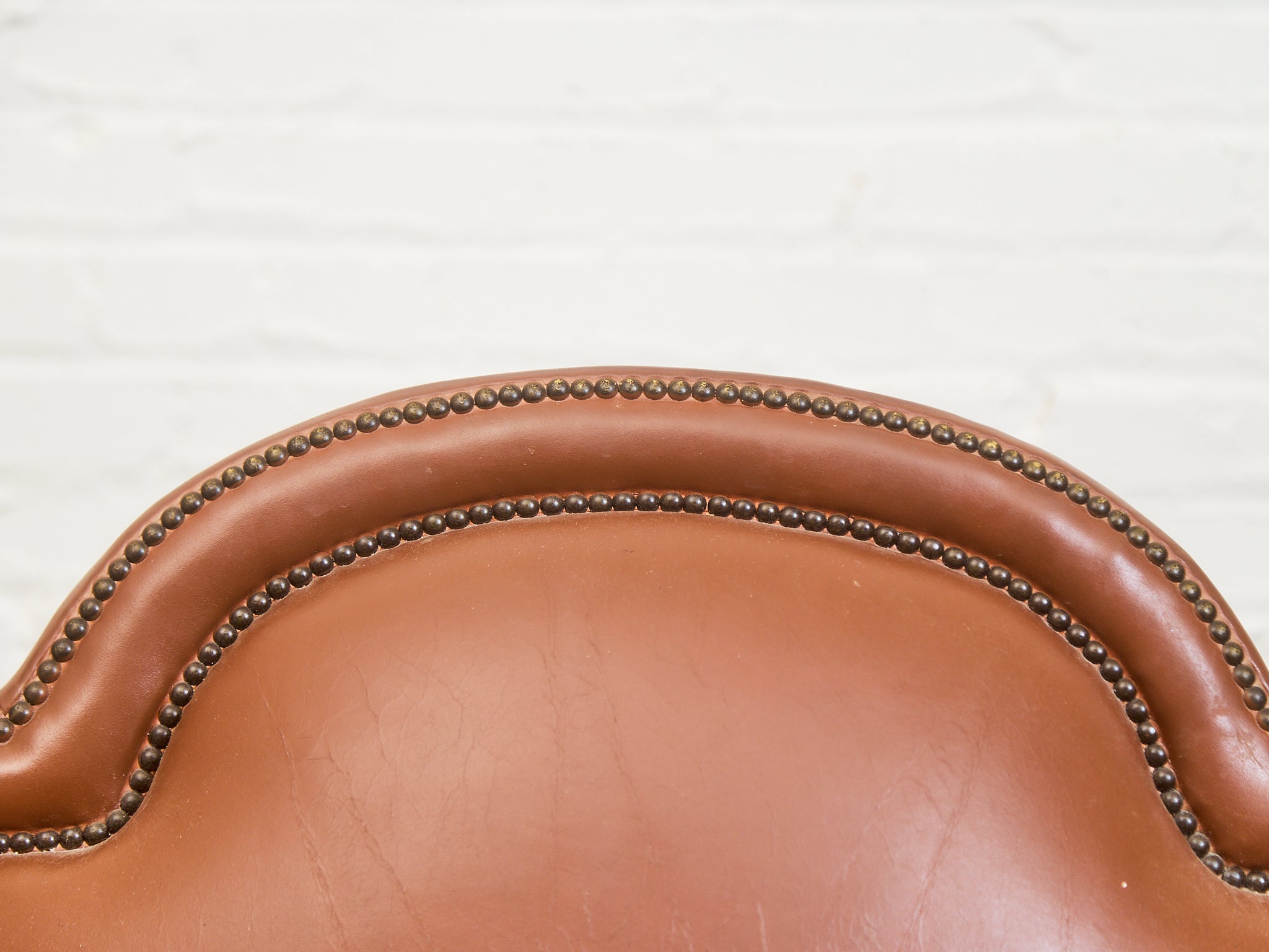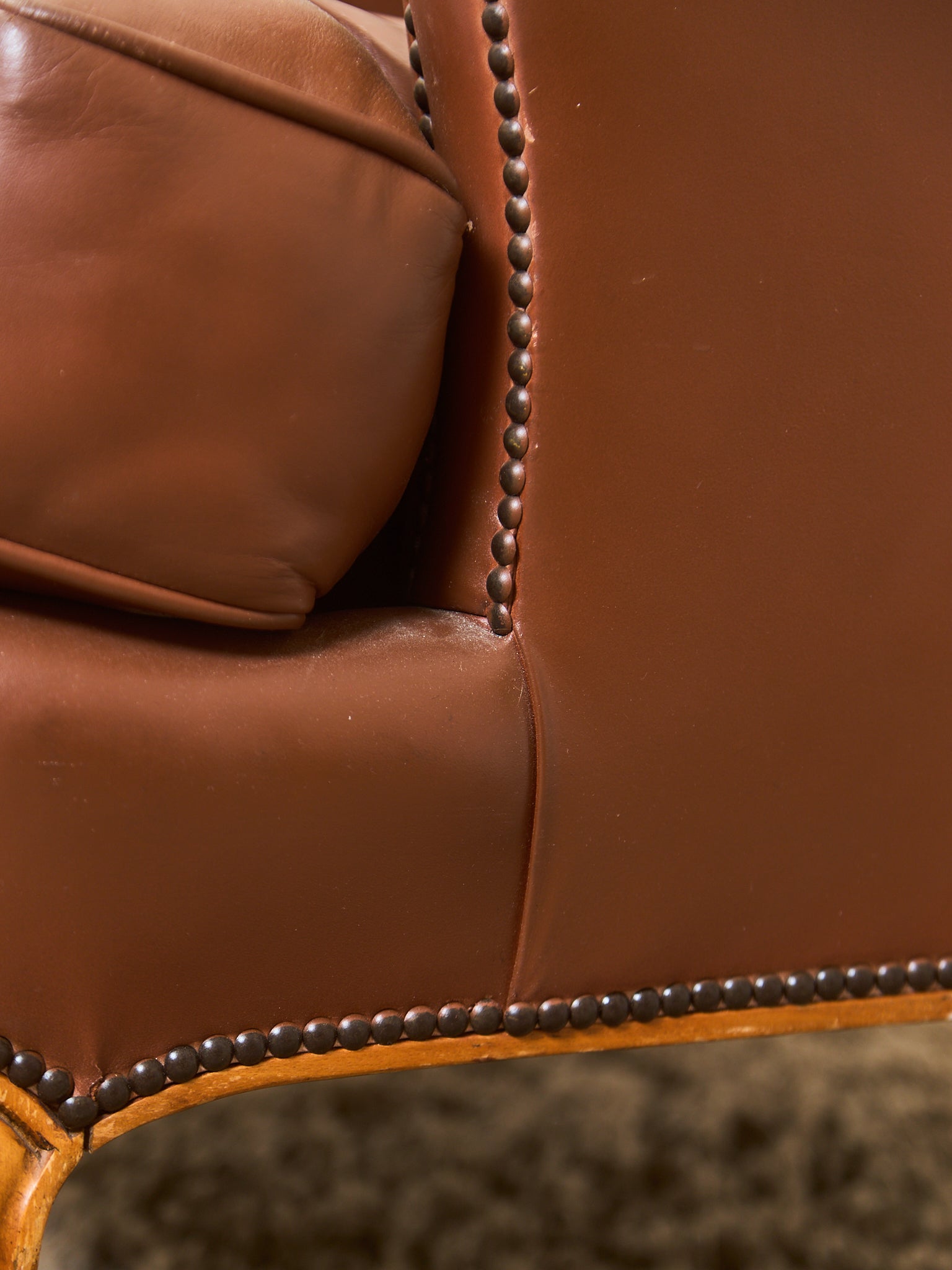 A stately leather bergère-style armchair featuring a gracefully arched back, rolled arms, and hand-applied brass nailhead trim. Its warm chestnut brown leather shows natural character and patina, adding to its timeless appeal. Cabriole legs in a medium wood finish lend a refined European influence, while the generous seat and plush down-filled cushion ensure comfort. A versatile statement chair perfect for a library