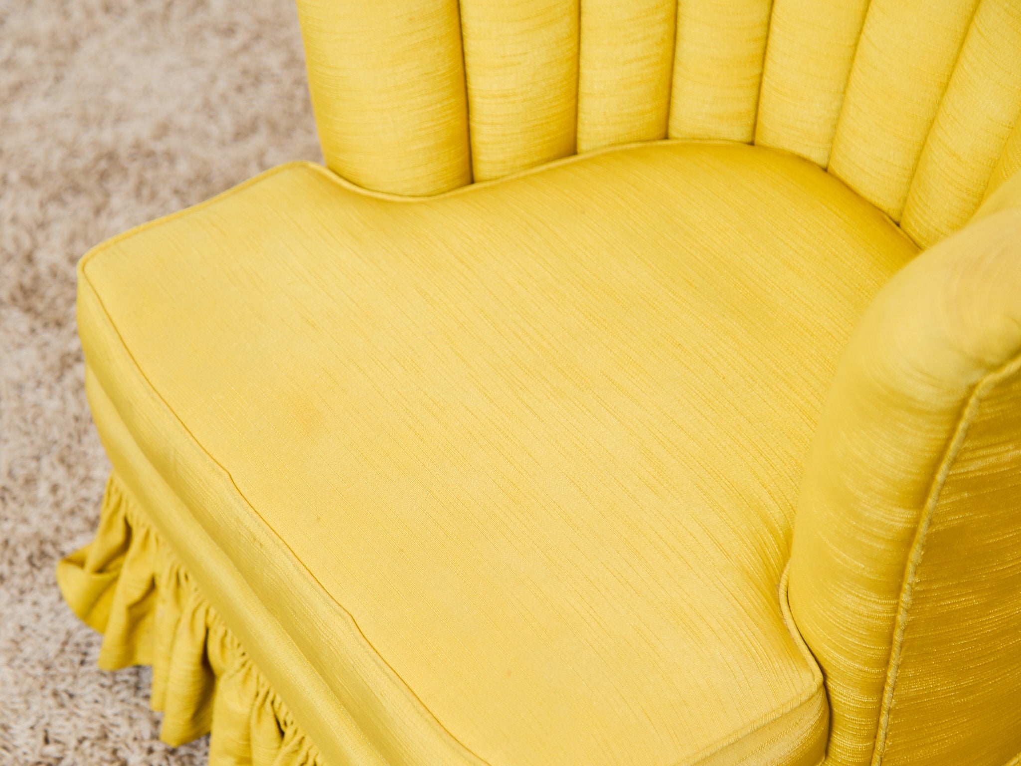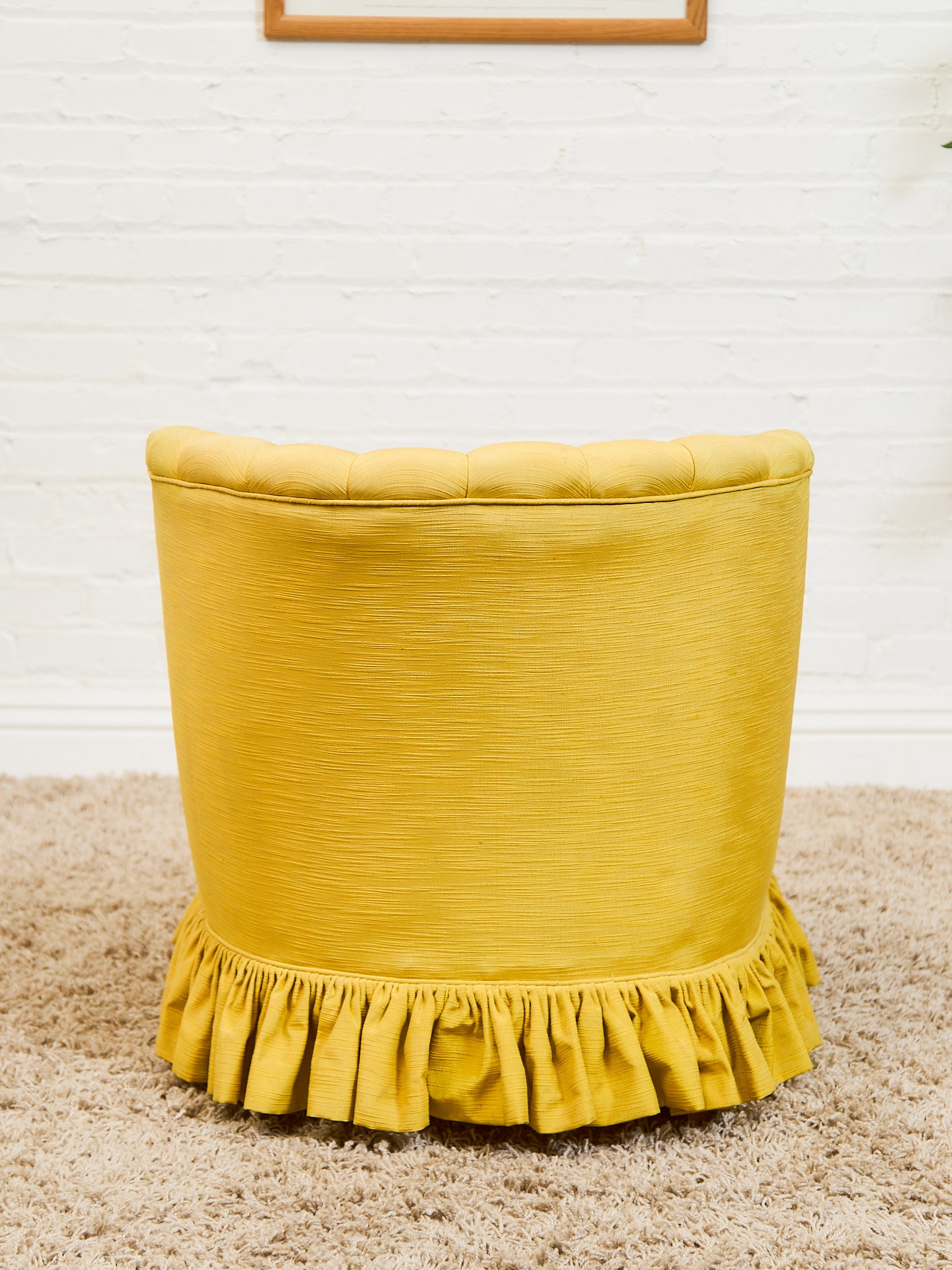 A glamorous low-profile slipper chair with dramatic channeled backrest and a rich goldenrod yellow upholstery. The tailored seat cushion and gathered skirt bring a touch of mid-century Hollywood Regency charm, while the vibrant color makes it a true statement piece. Perfect for adding warmth and personality to a bedroom, reading nook, or curated living room.