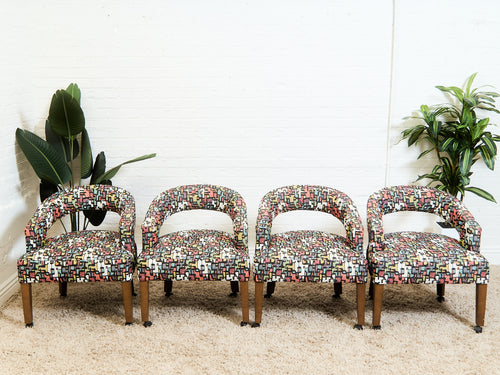 • Set of Mid-Century Barrel Arm Chairs in Abstract Upholstery