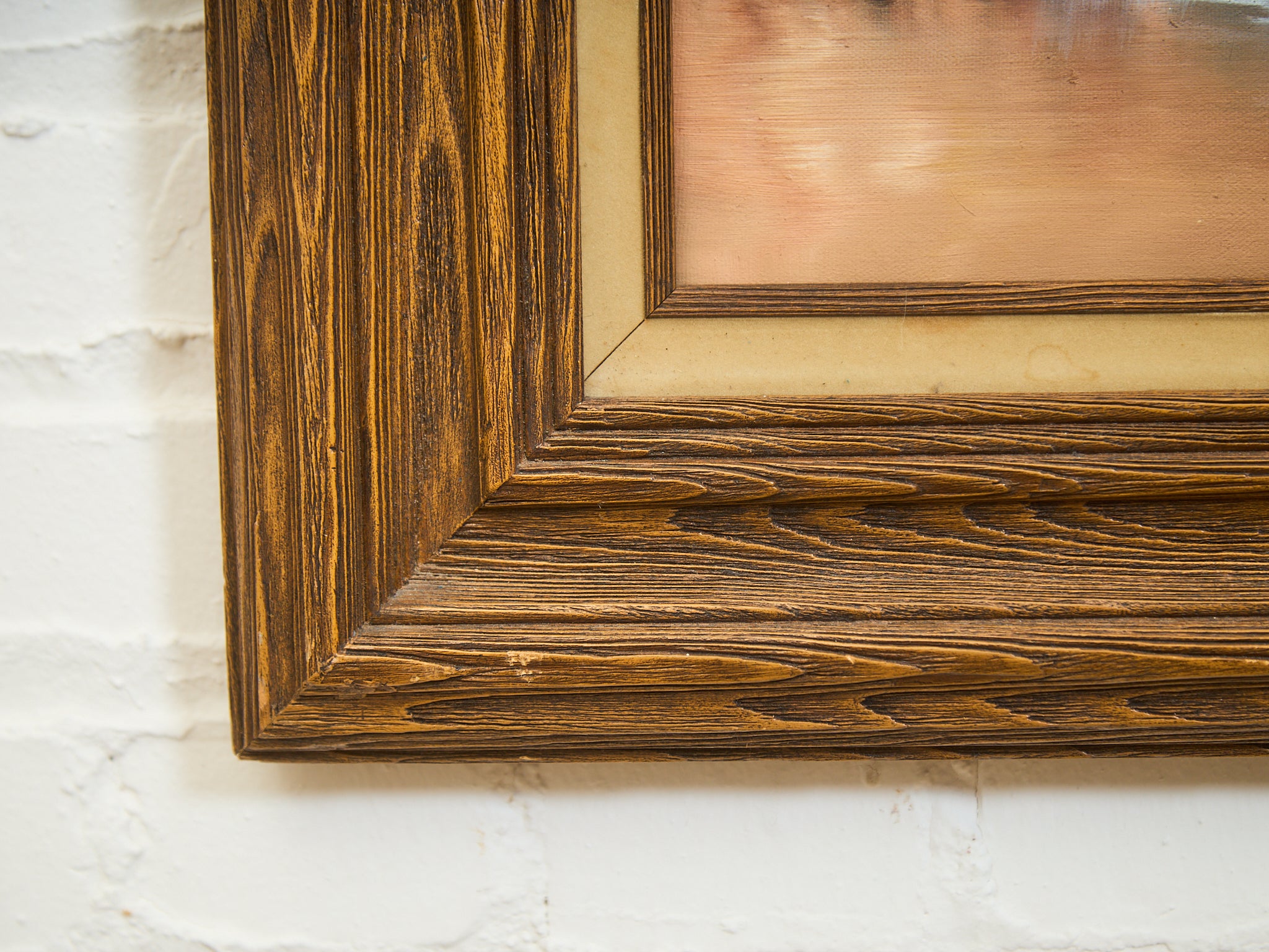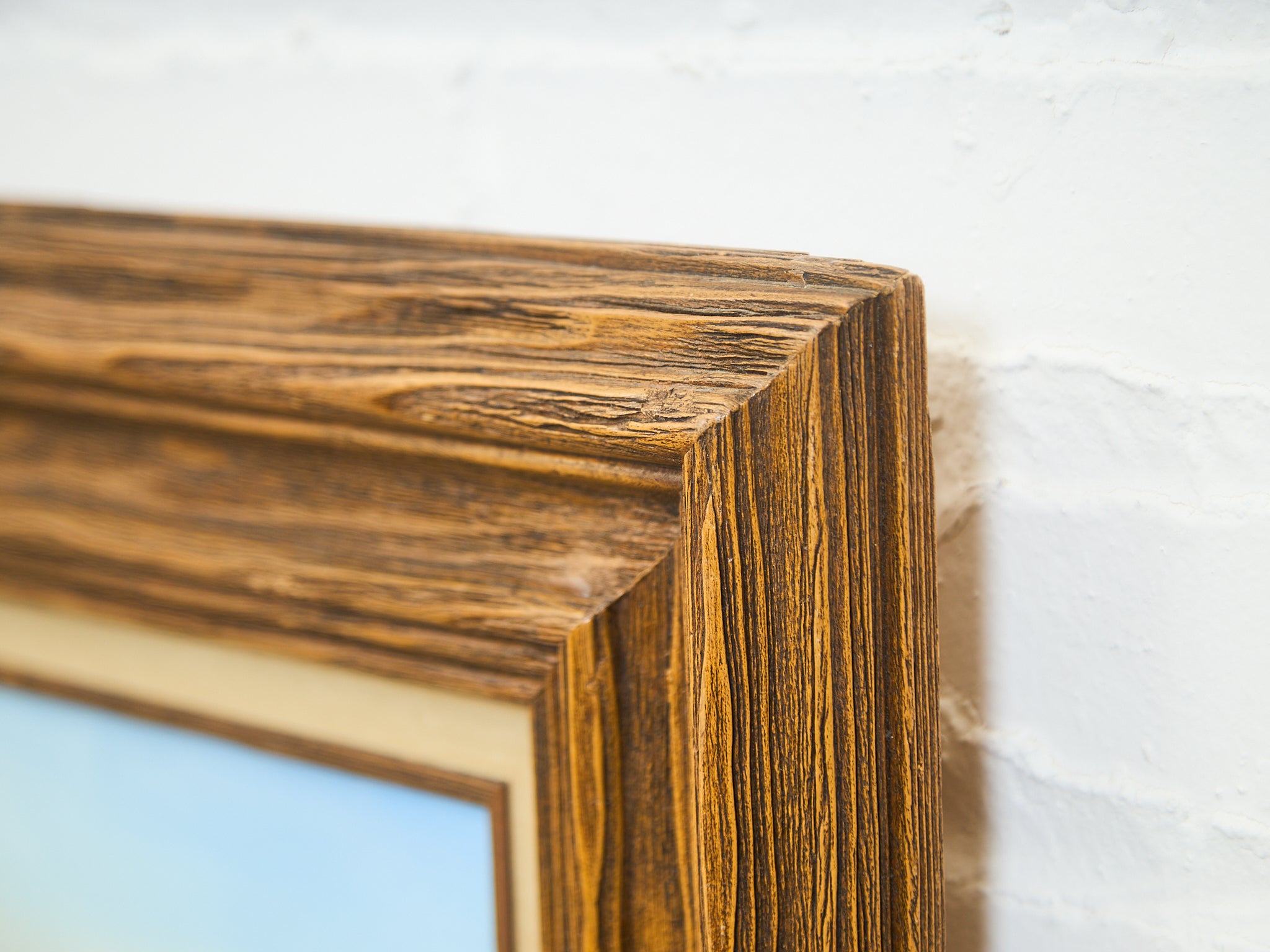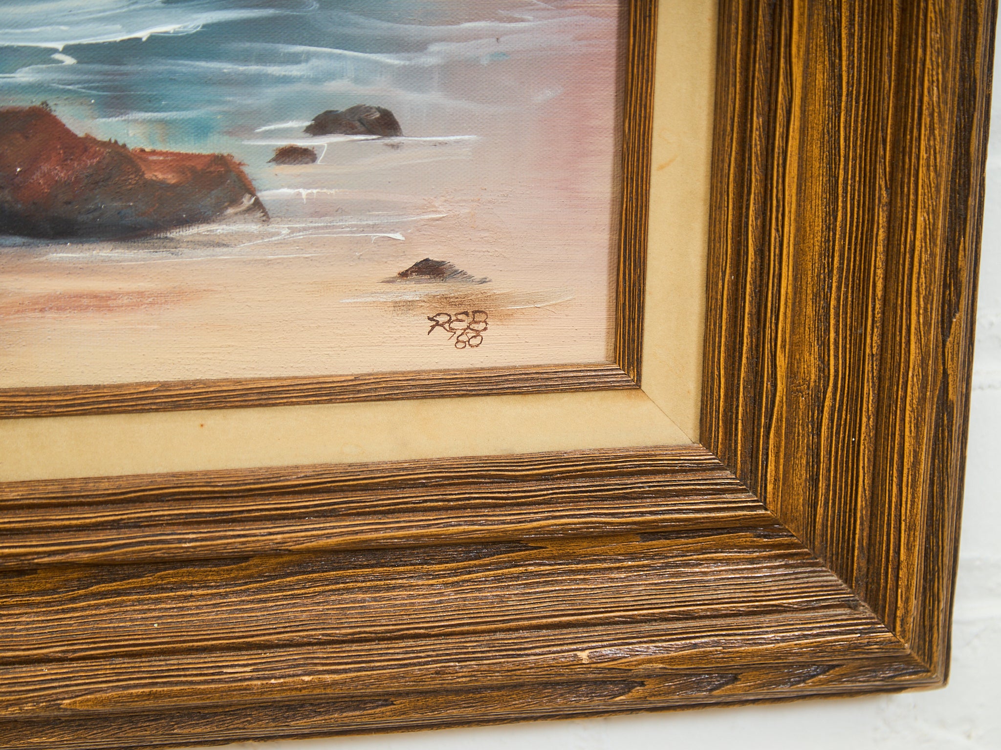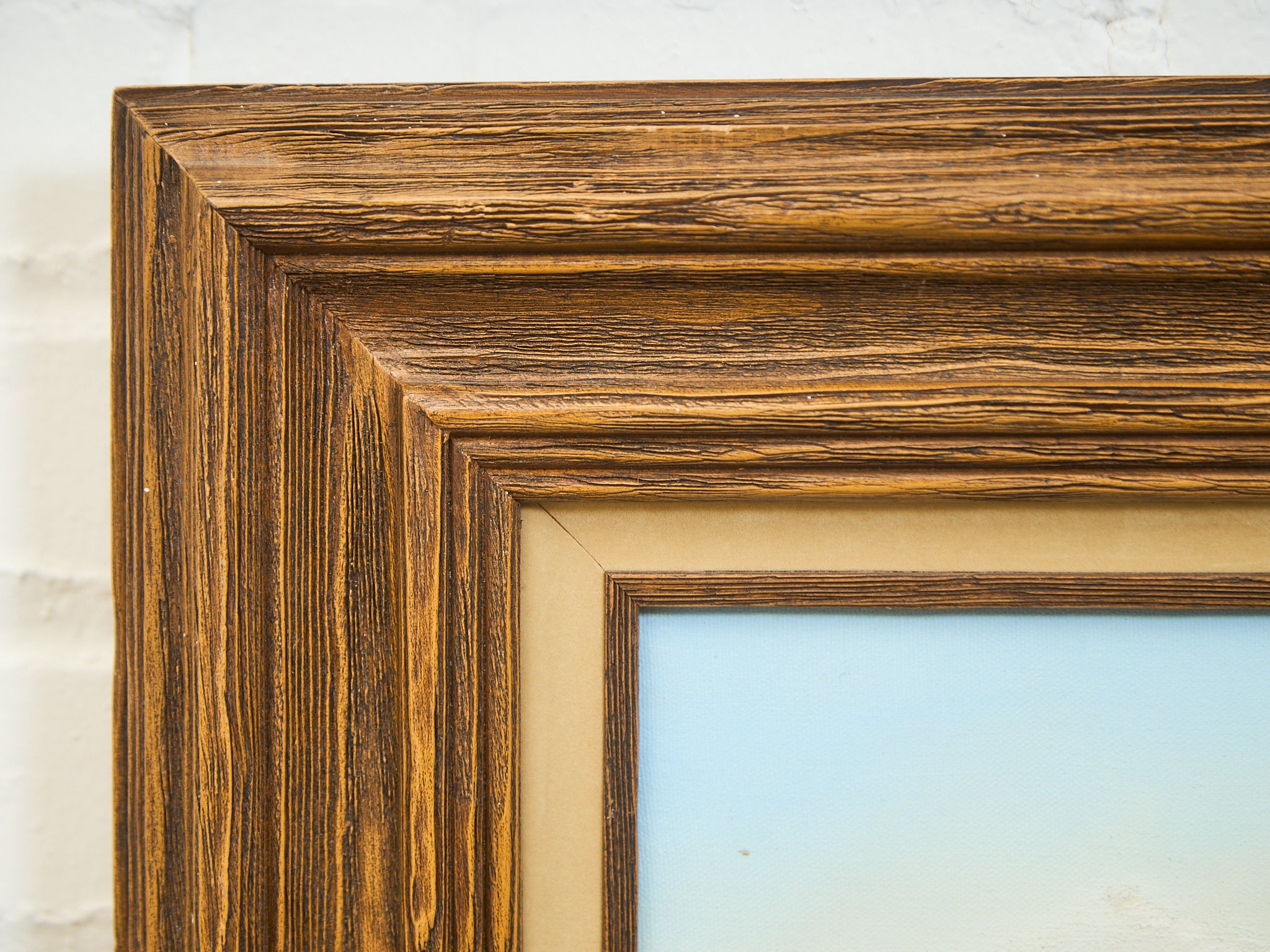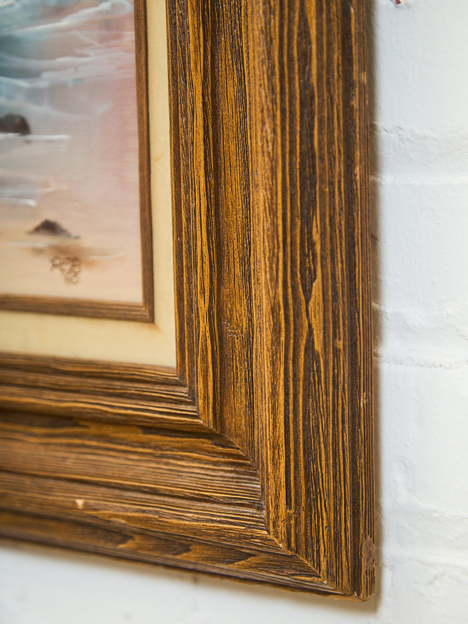 A tranquil seascape capturing the rhythmic beauty of waves breaking against the shoreline. The artist layers soft blues and greens to depict the motion of the ocean, while rocky outcrops anchor the composition with earthy contrast. Gentle sunlight filters across the water, lending a calming glow to the scene. Framed in a richly grained wood frame, this piece evokes the timeless peace of standing at the edge of the sea.