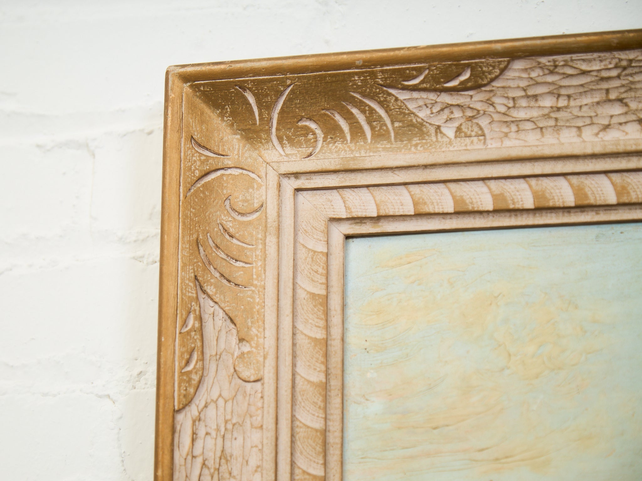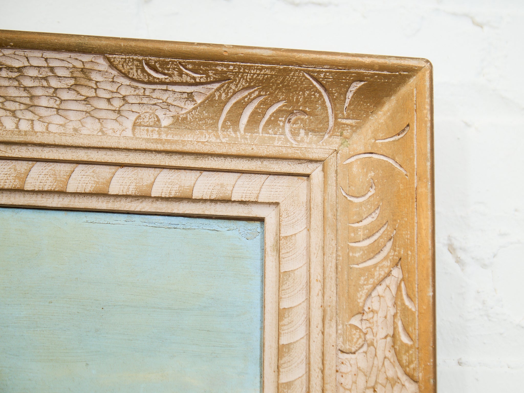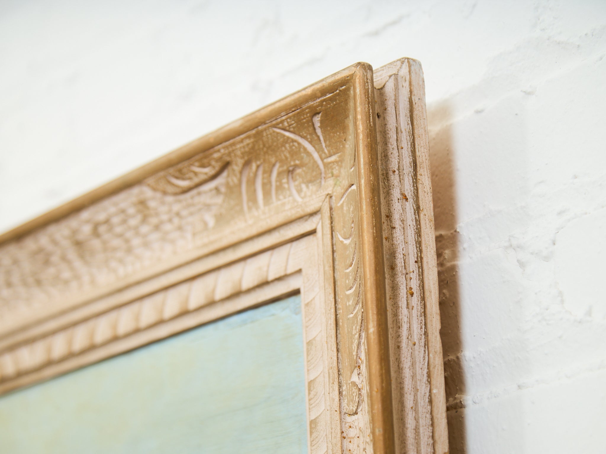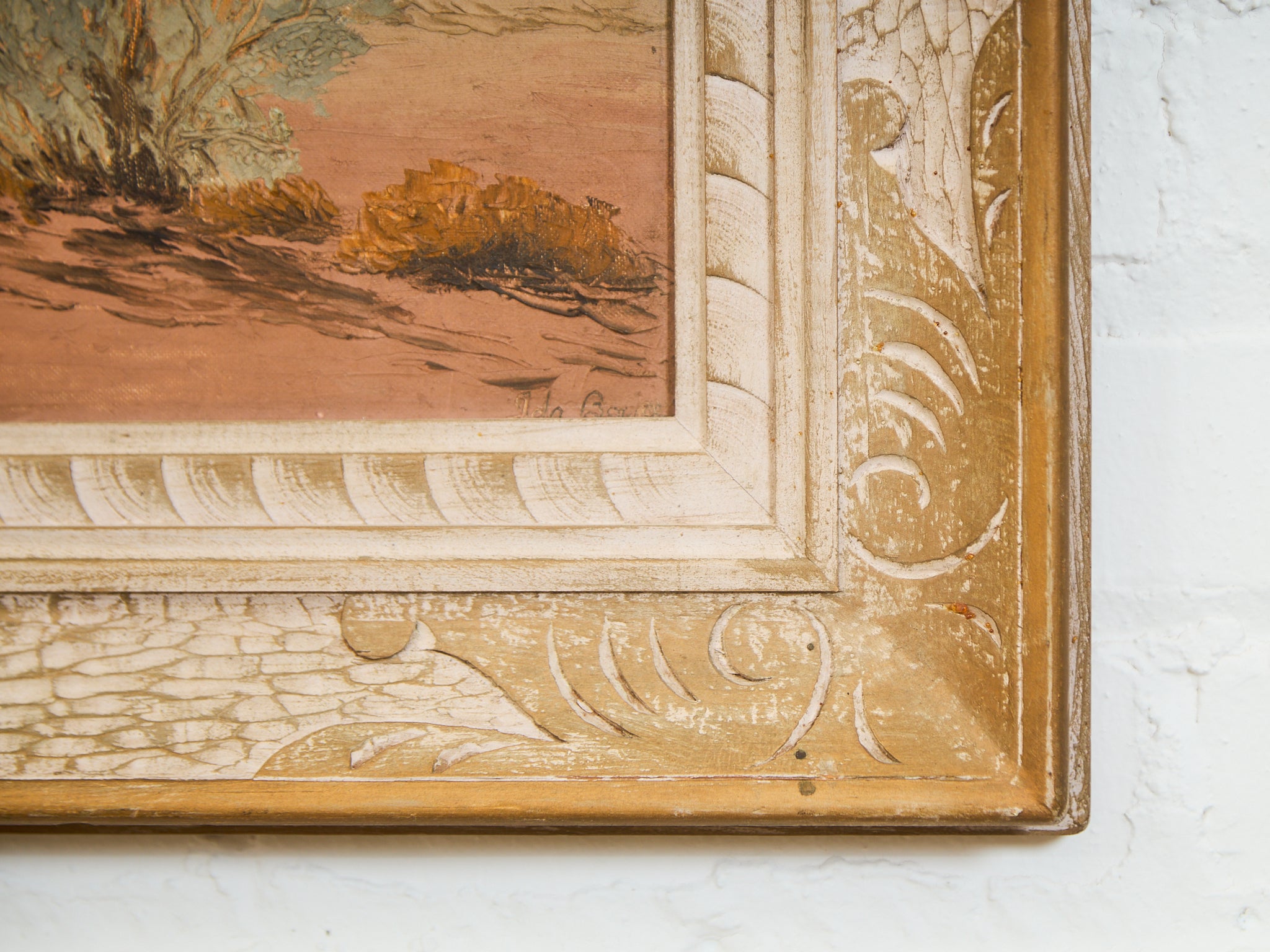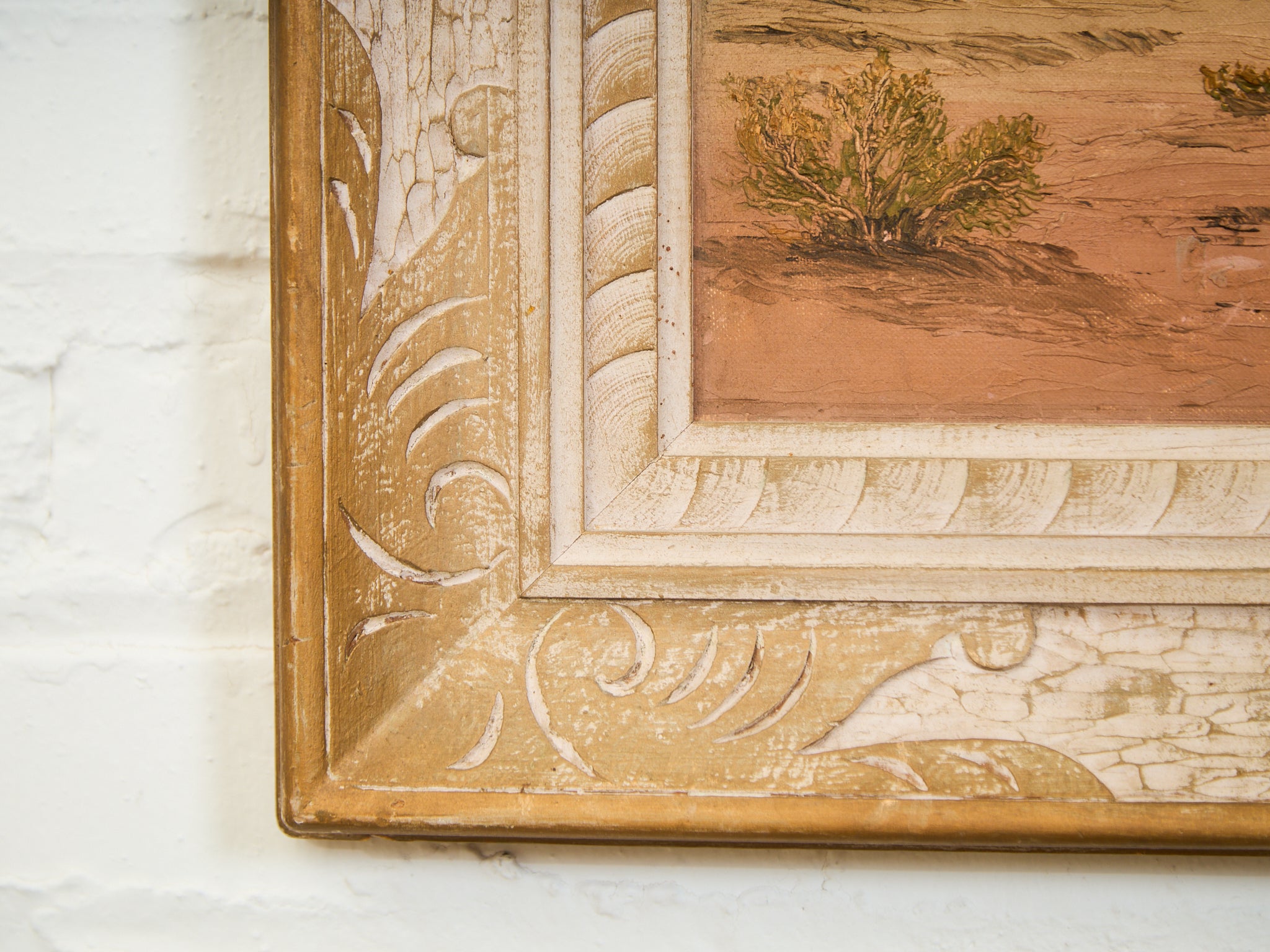 A serene and softly luminous desert scene capturing the delicate glow of sun-kissed mountains under a wide blue sky. The composition centers around a sage green desert shrub in the foreground, with subtle textures of dry brush and earth surrounding it. The warm, peachy tones of the distant mountains contrast beautifully with the cool pastel sky, suggesting either early morning or golden hour light. Framed in a dramatic, carved, and textured frame with crackled ivory and antique gold detailing, this piece evokes both vintage Western charm and timeless natural beauty