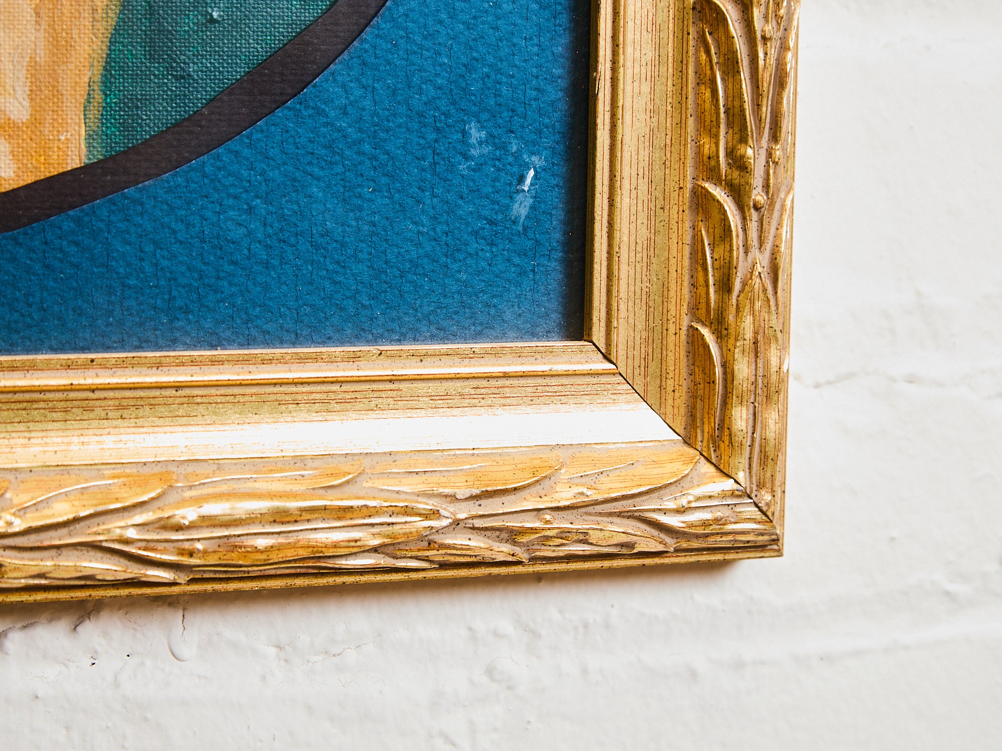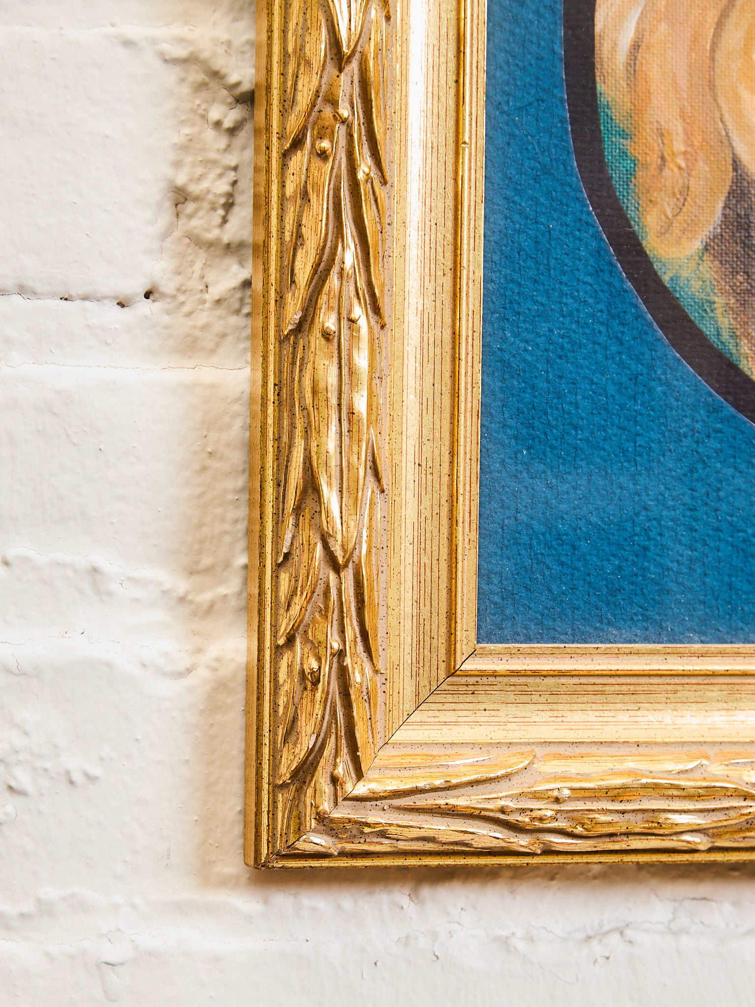 A sweet, hand-painted portrait featuring two golden retrievers, captured with big expressive eyes and joyful, open-mouthed smiles. The artist placed them in an oval vignette set against a rich teal background, giving the piece a classic portrait feel with a touch of whimsy. Housed in an ornate gilt frame with sculpted leaf detailing, this artwork brings warmth, personality, and a bit of nostalgic charm to any space. Ideal for dog lovers, gallery walls, or anyone who appreciates heartfelt, character-driven art.