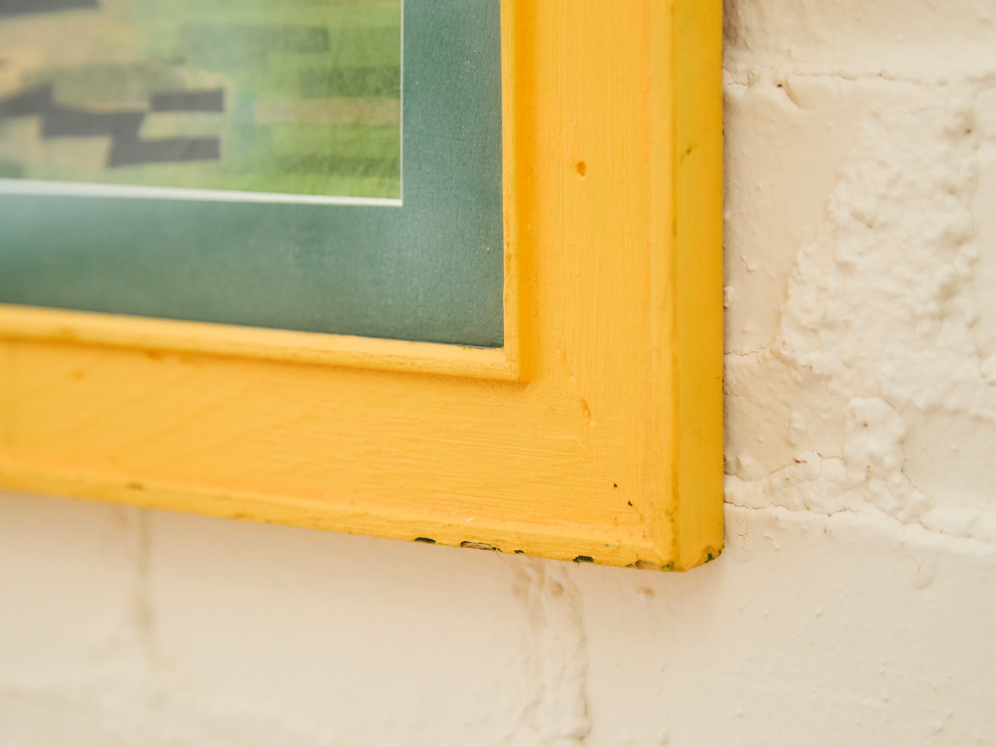 Vivid and full of movement, this midcentury harbor scene by unknown artist captures a docked boat surrounded by abstract waterfront buildings, signage, and reflections in the water. Rendered in geometric brushstrokes and saturated color blocks — seafoam green, saffron, coral, and cobalt — this piece radiates energy. Framed in sunshine yellow wood with teal matting for that perfect Palm Springs pop.