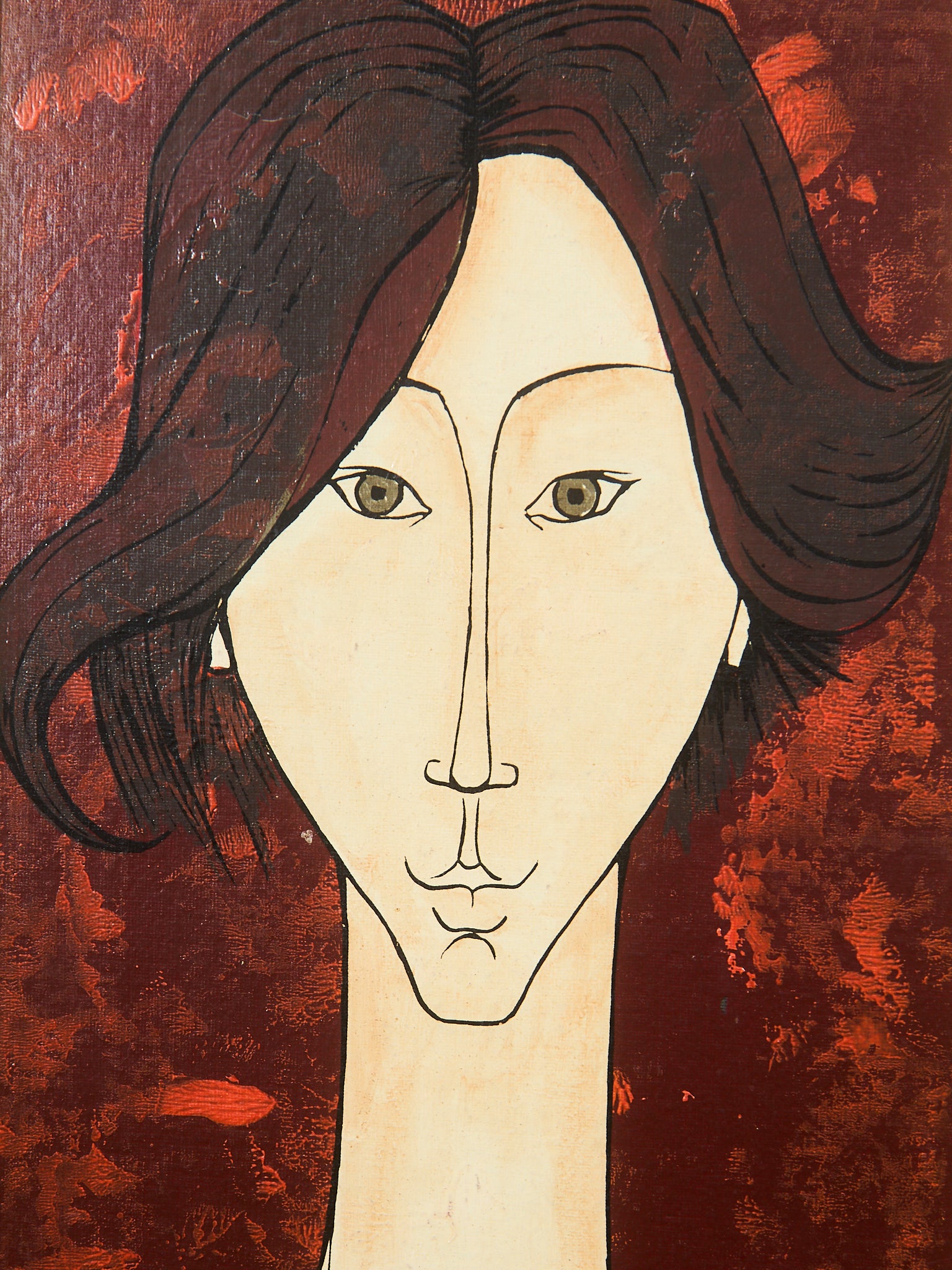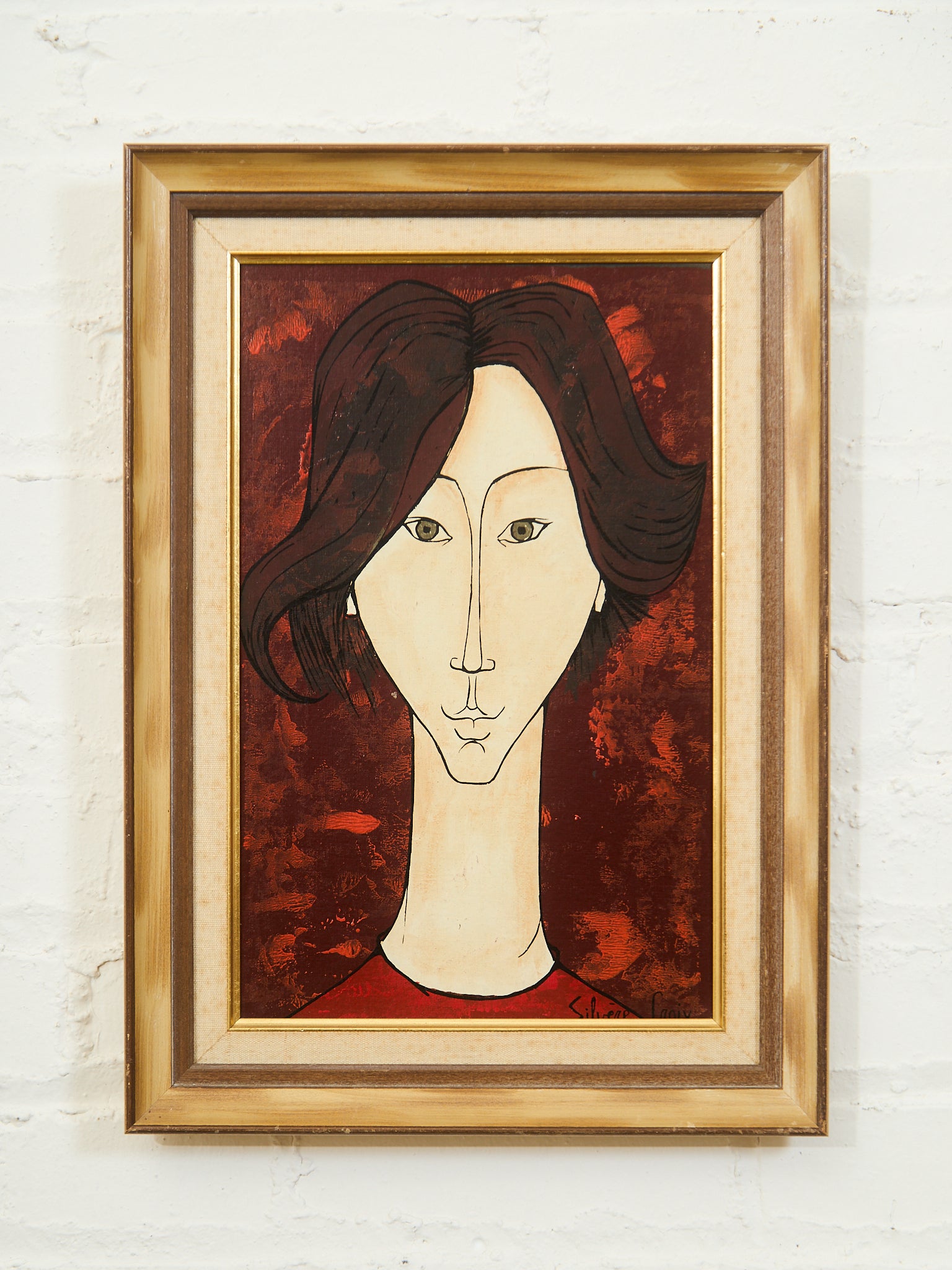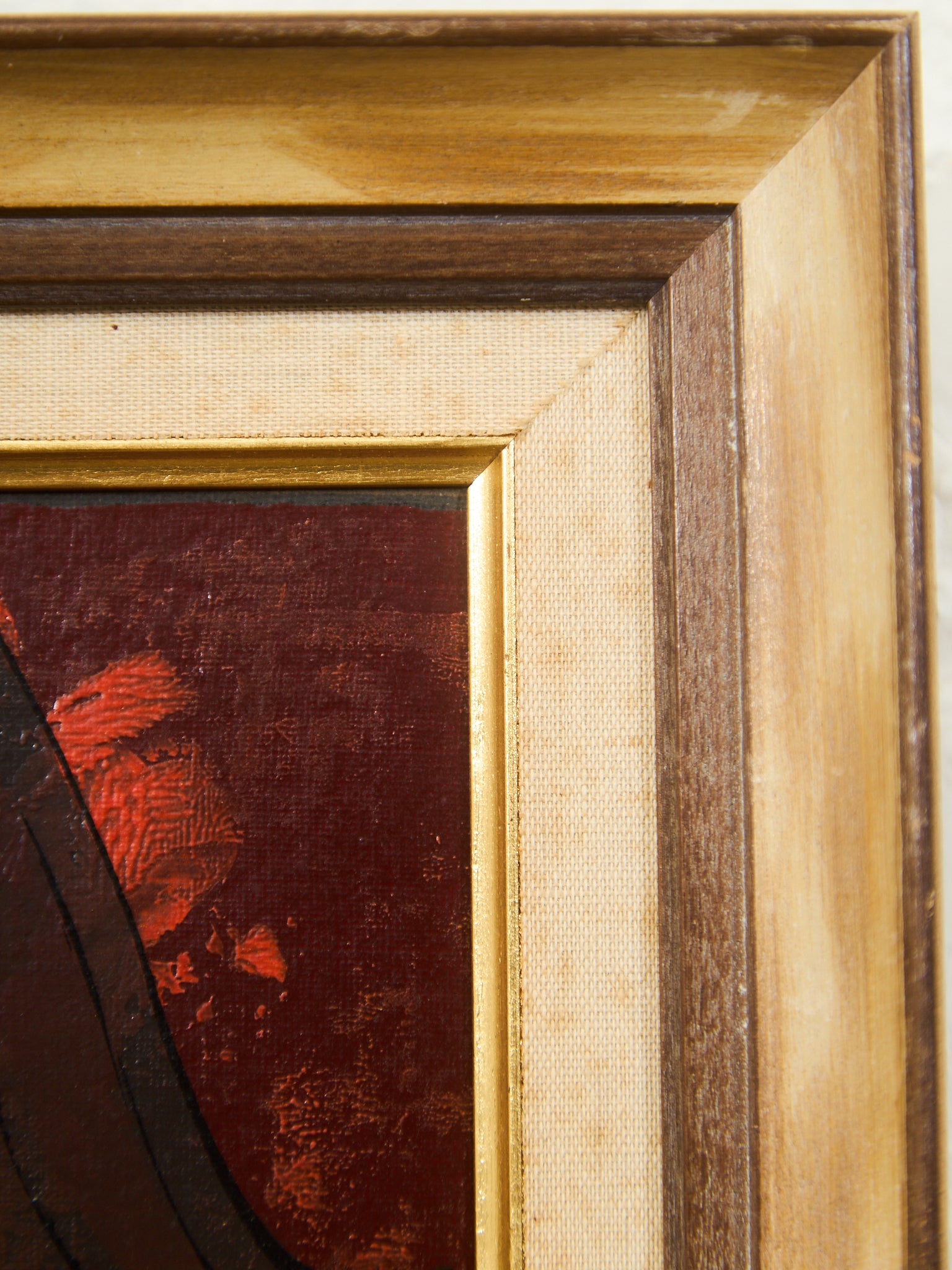 Mid-Century Modern Portrait Painting in Red and Walnut Frame