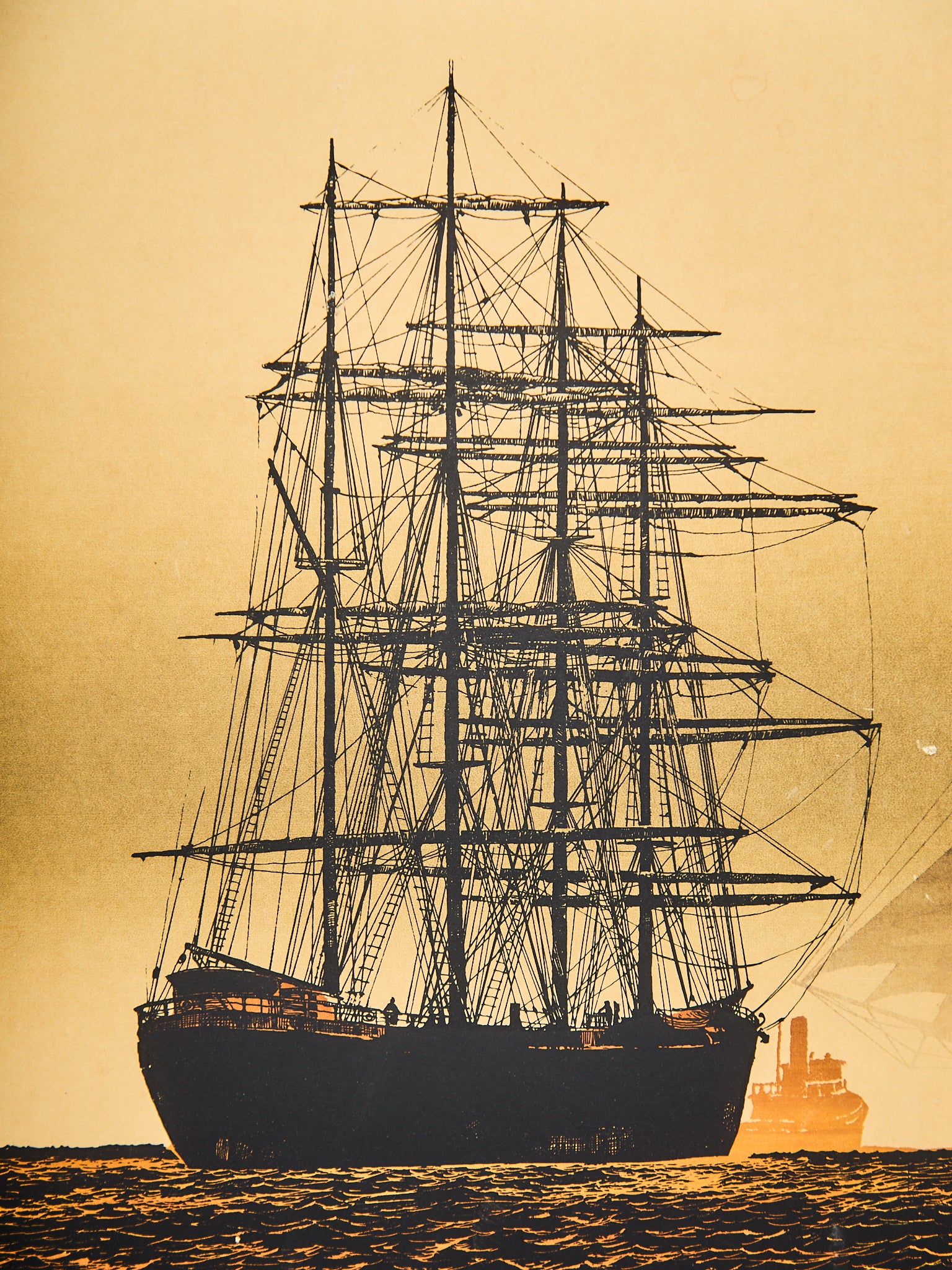 Misty Harbor With Tall Ships Maritime Silhouette Print
