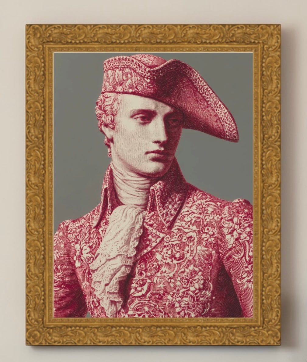 Magenta aristocrat portrait in an ornate gold frame. A classical European inspired artwork with romantic vintage style, ideal for gallery walls, eclectic interiors, and traditional or modern decor.