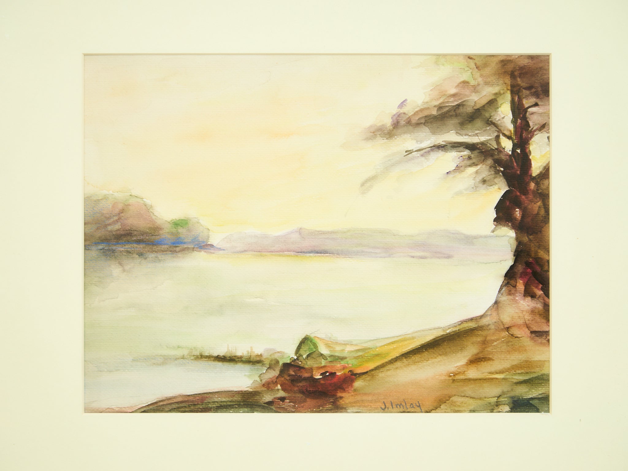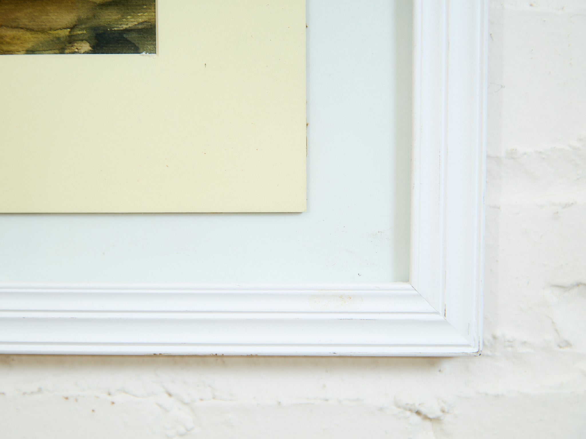 A graceful original watercolor by Tim Campbell, depicting a cluster of wind-bent pine trees rendered in expressive, fluid brushstrokes. Earthy greens and warm ochres blend effortlessly with soft washes of blue, creating a sense of organic movement and quiet resilience. Signed by the artist and elegantly framed with a moss-green mat and brushed metal frame, this piece brings a serene, naturalistic energy—perfect for mid-century, modern rustic, or coastal interiors.