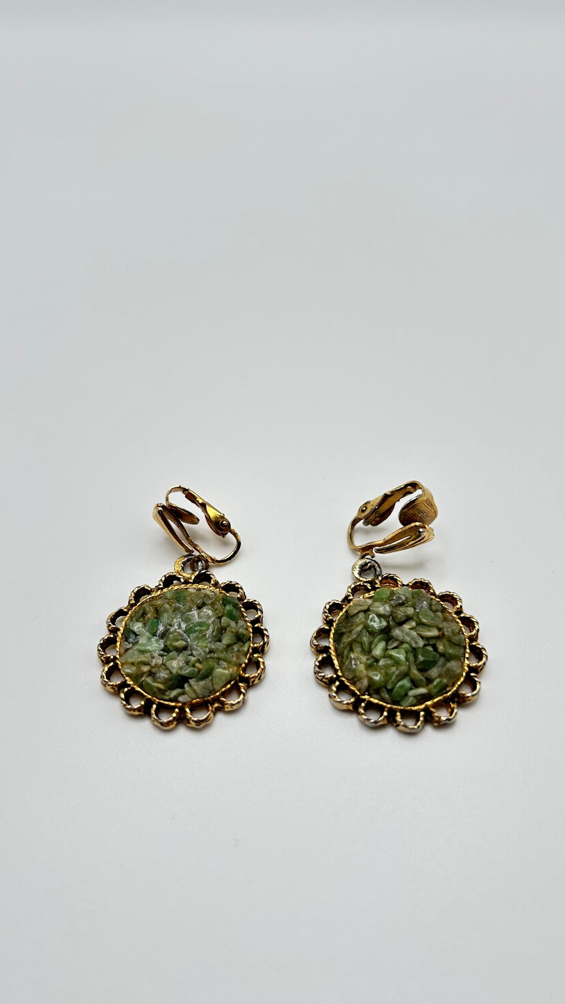 A lovely pair of vintage clip-on earrings featuring textured green stone mosaic centers framed by delicate gold-tone filigree. The organic stone fragments create rich variation in color and surface, giving each earring depth and a naturally earthy elegance. The scalloped metal border adds a soft, decorative finish that feels both classic and slightly bohemian.