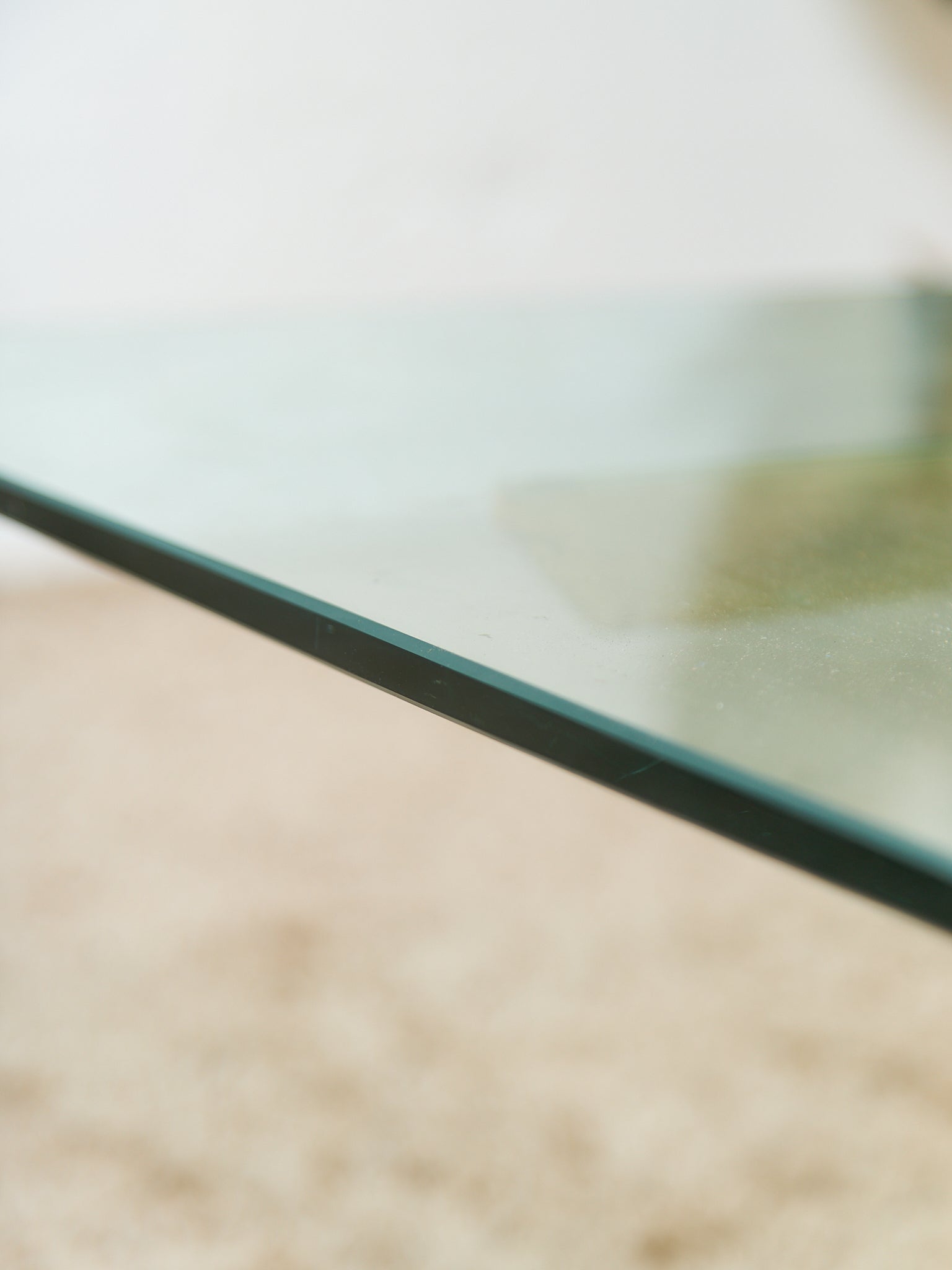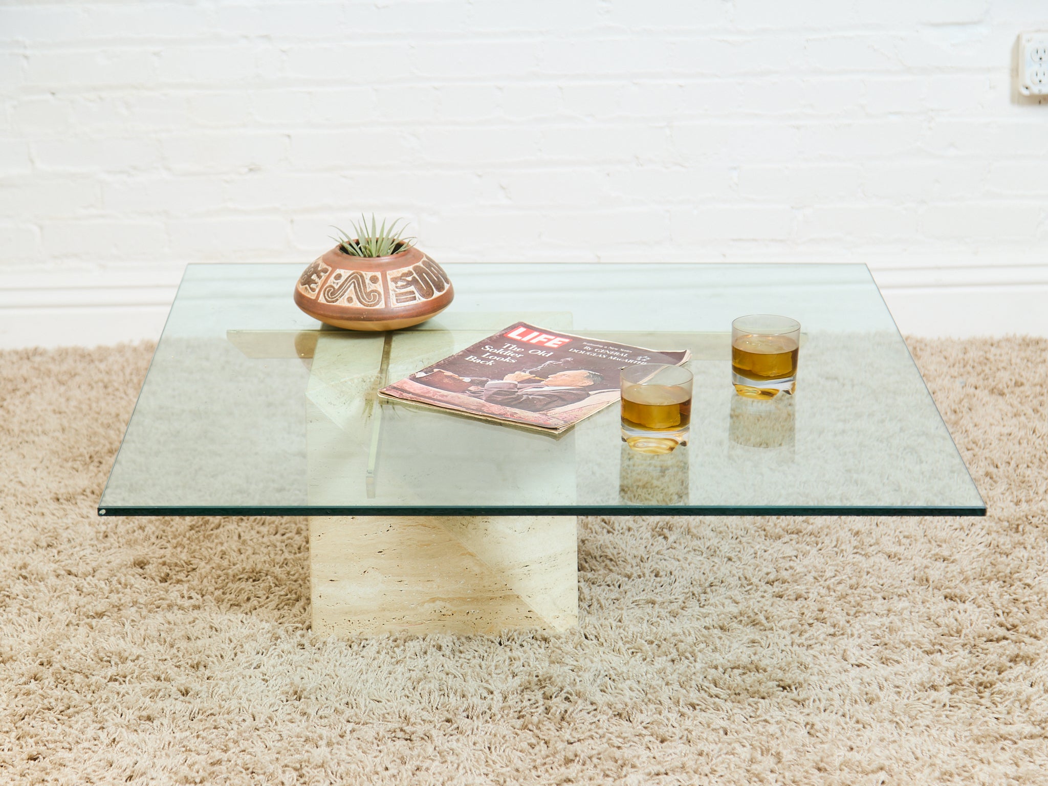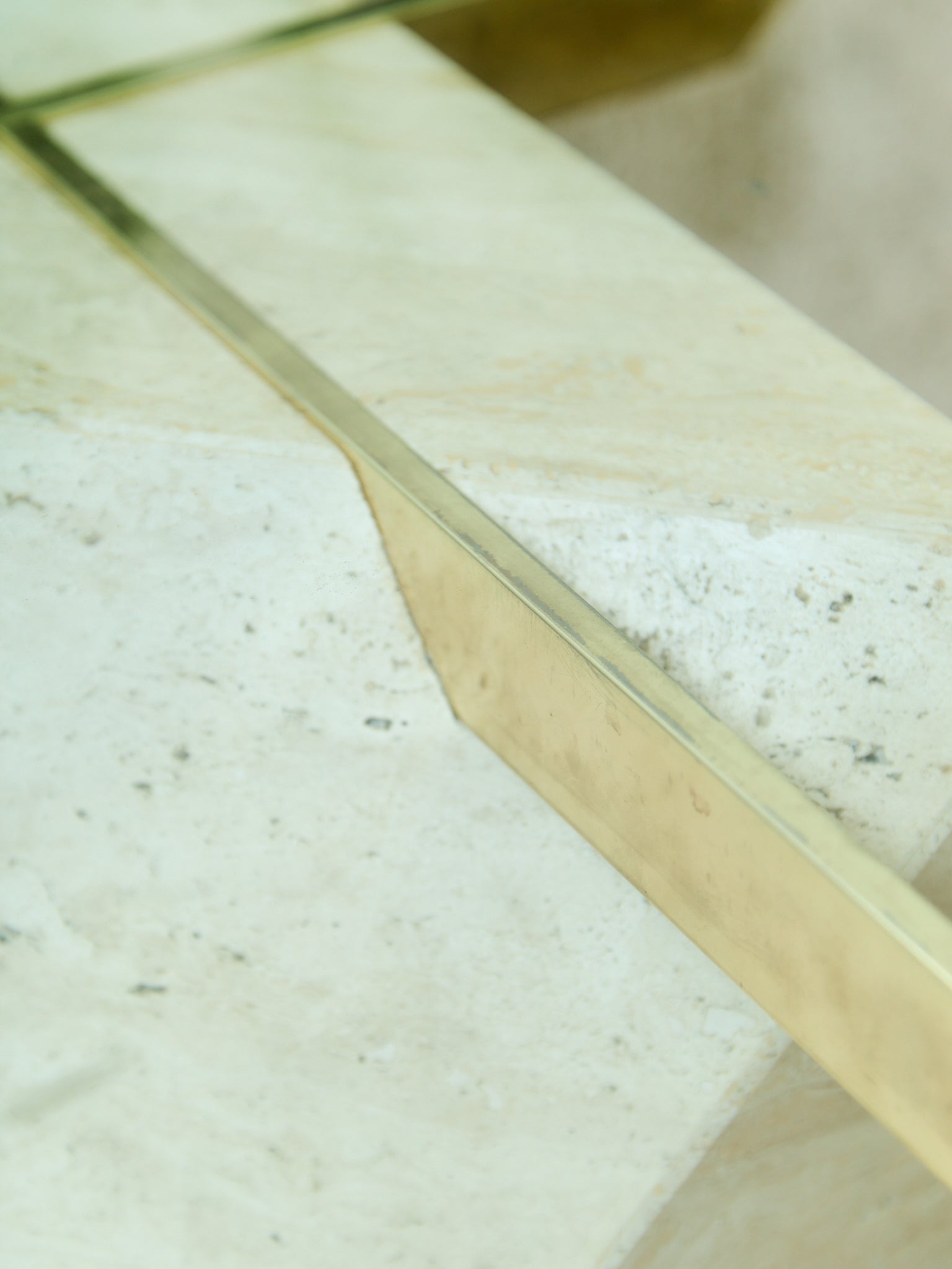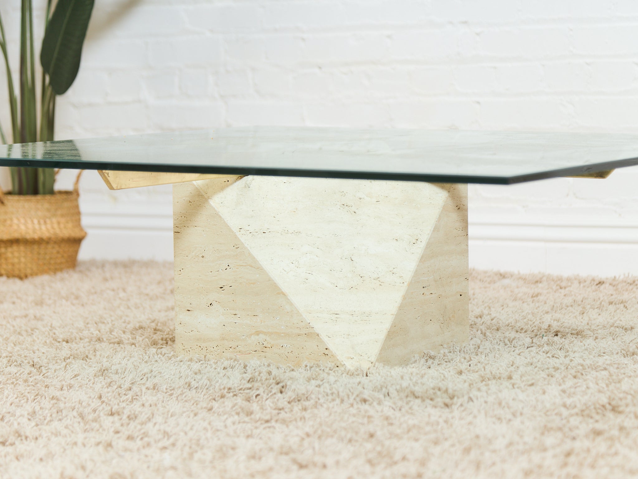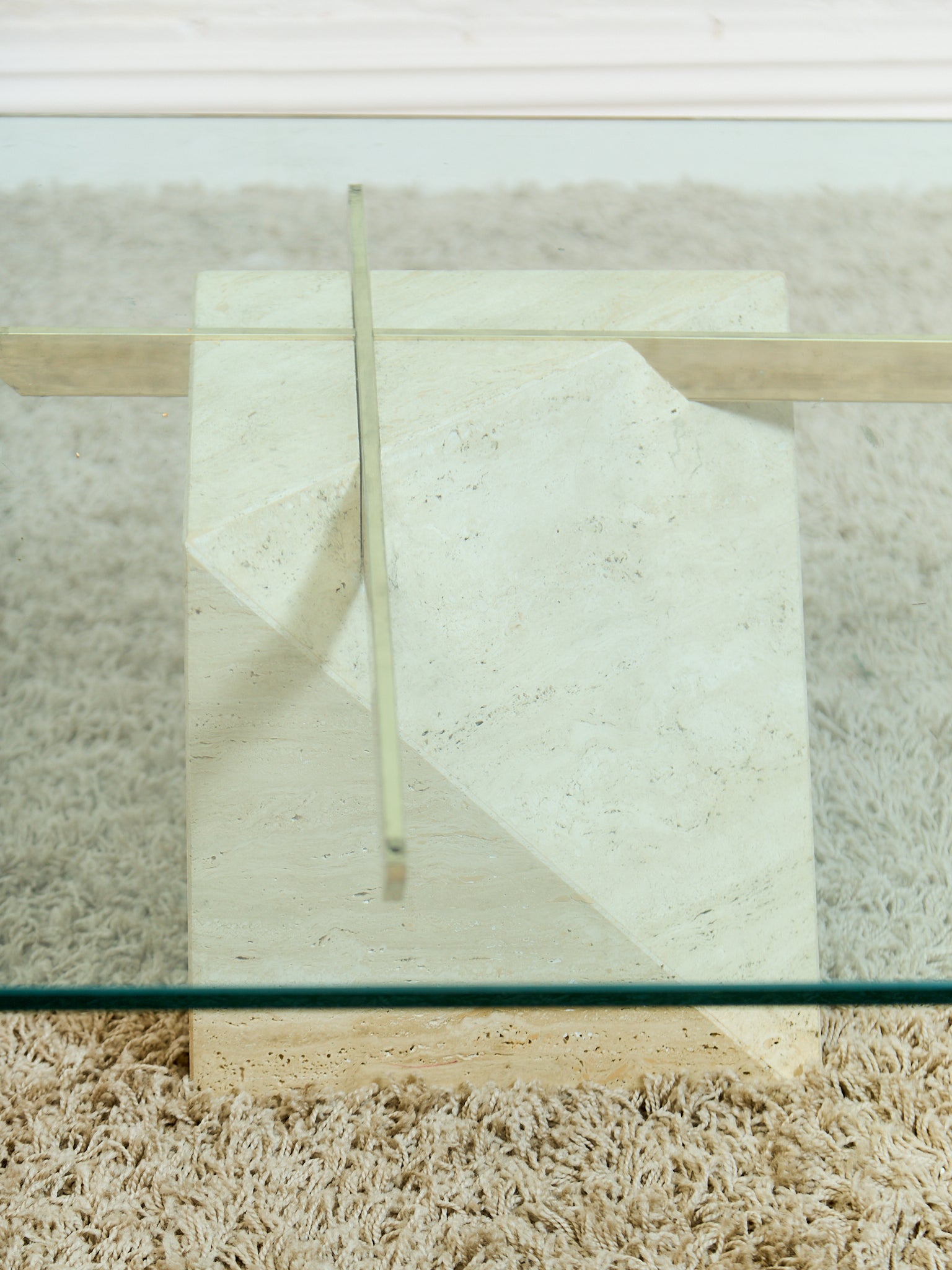 1970s Artedi Travertine and Brass Coffee Table With Glass Top Made in Italy