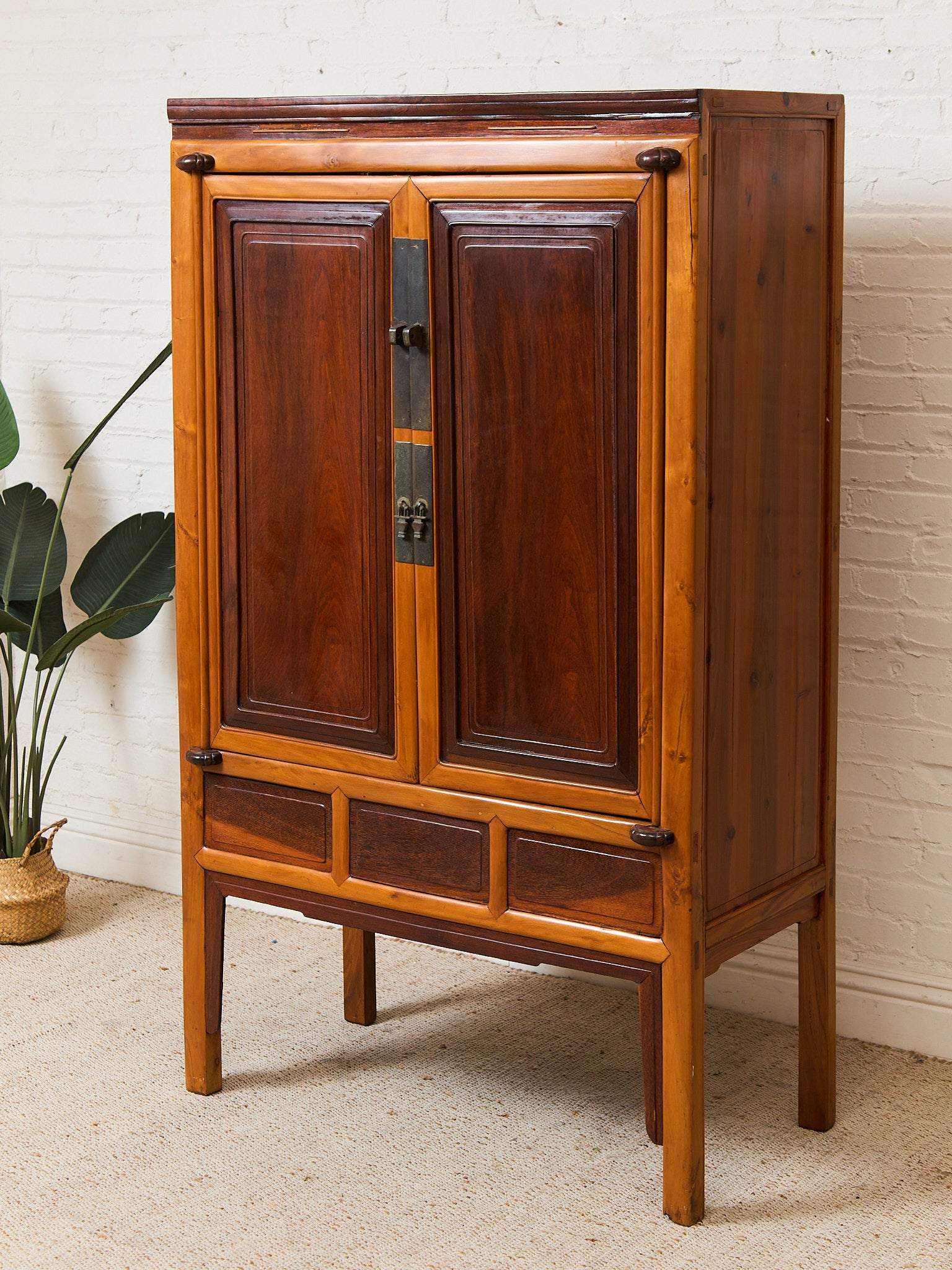 Qing Dynasty Ningbo Cypress and Rosewood Cabinet with Brass Hardware