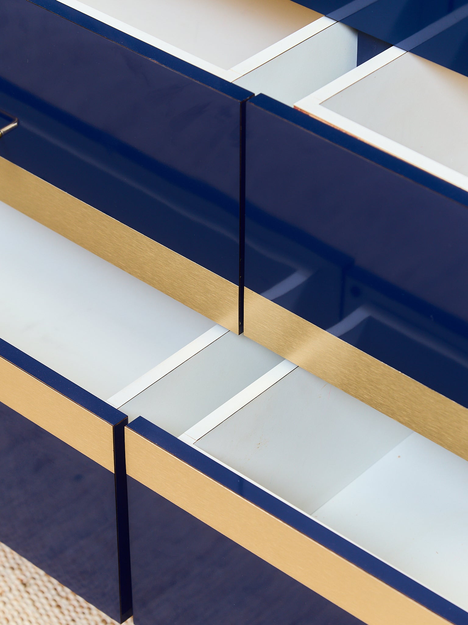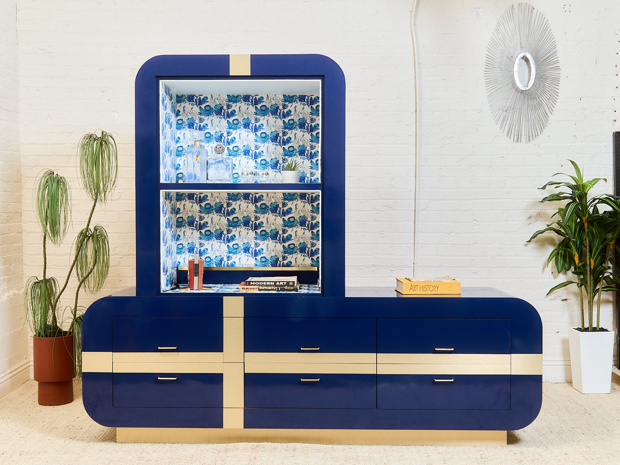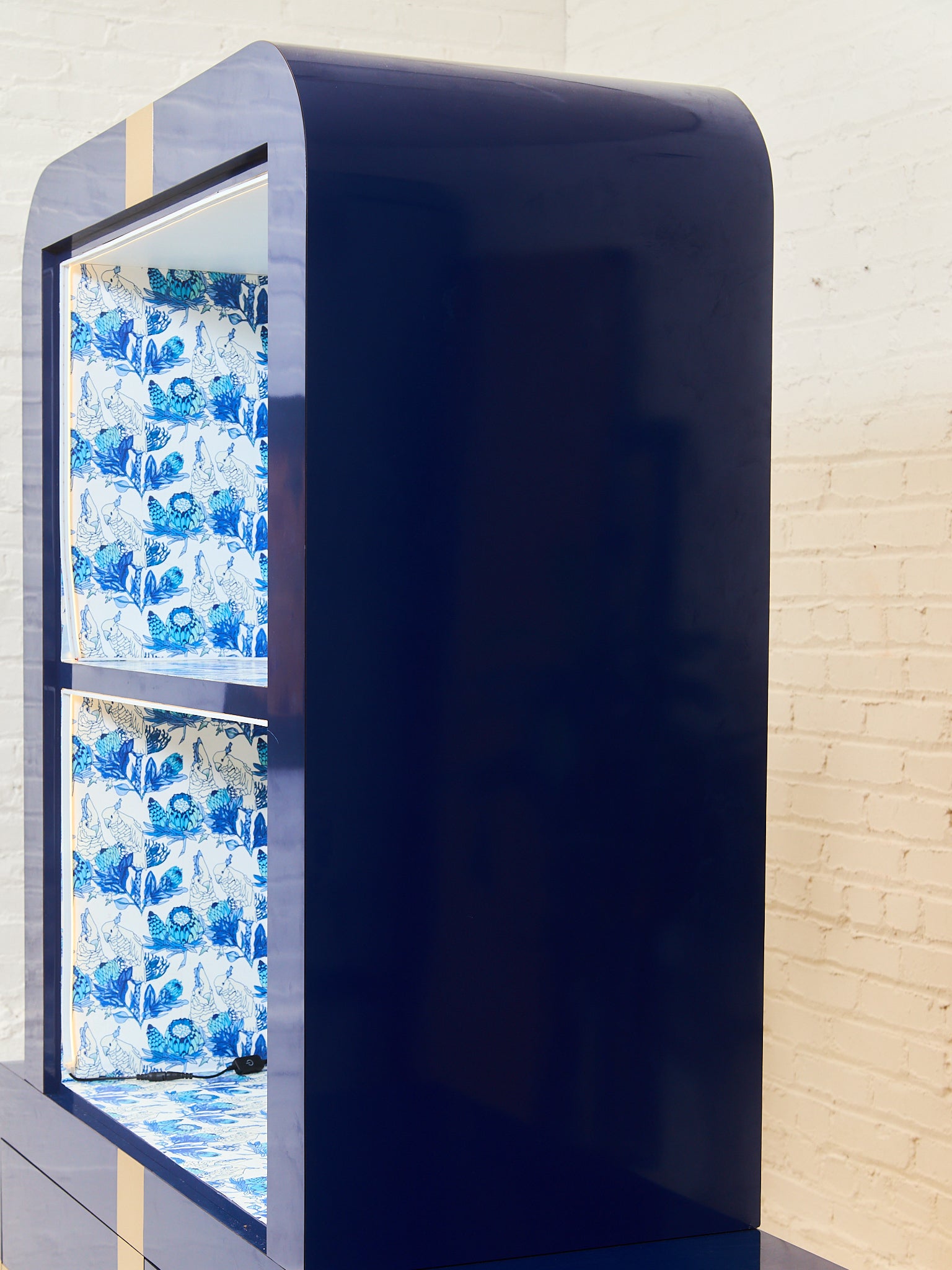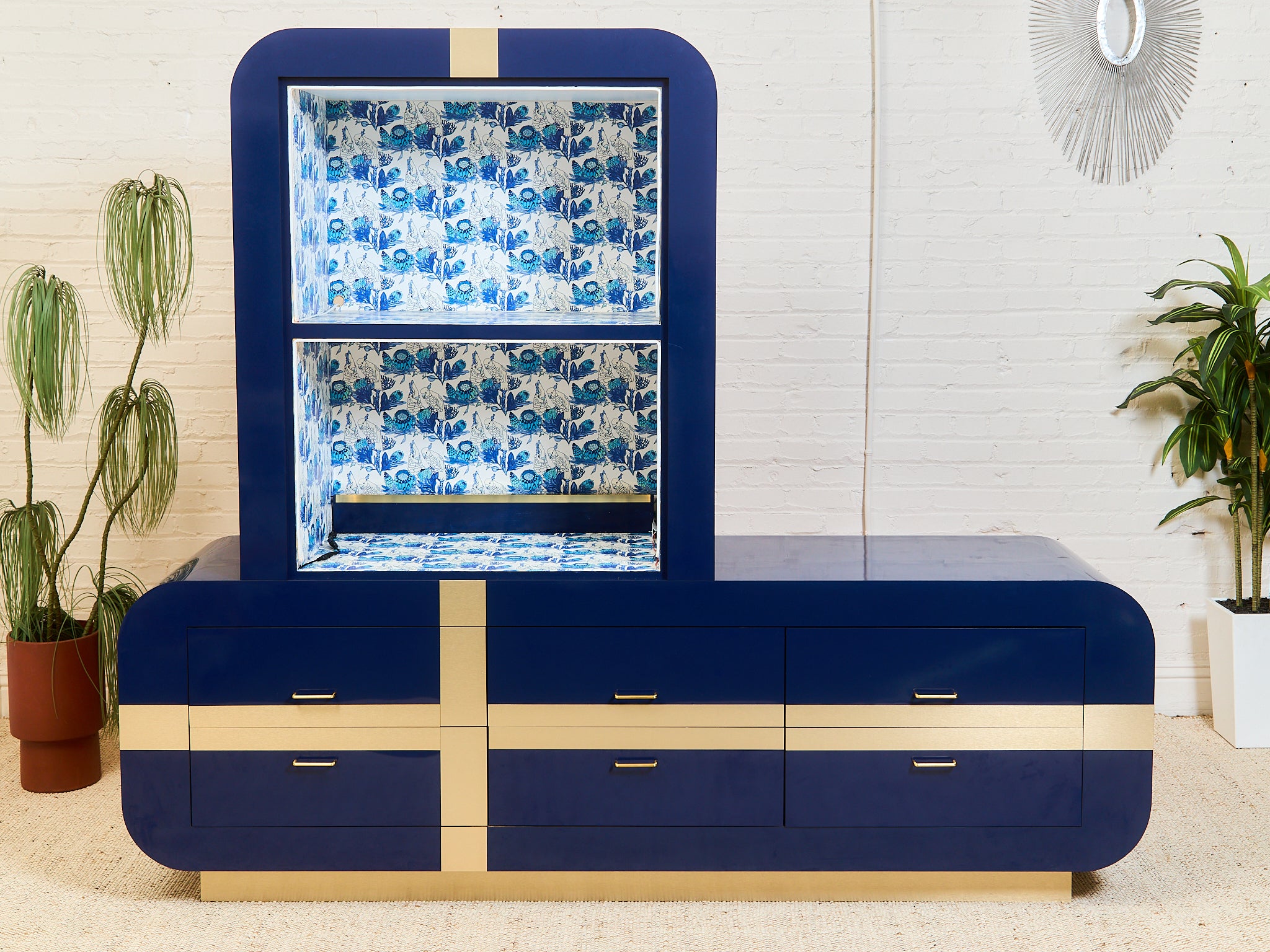 1970’s Italian 2 Piece Post Modern Blue and Gold Hutch with Plinth Base