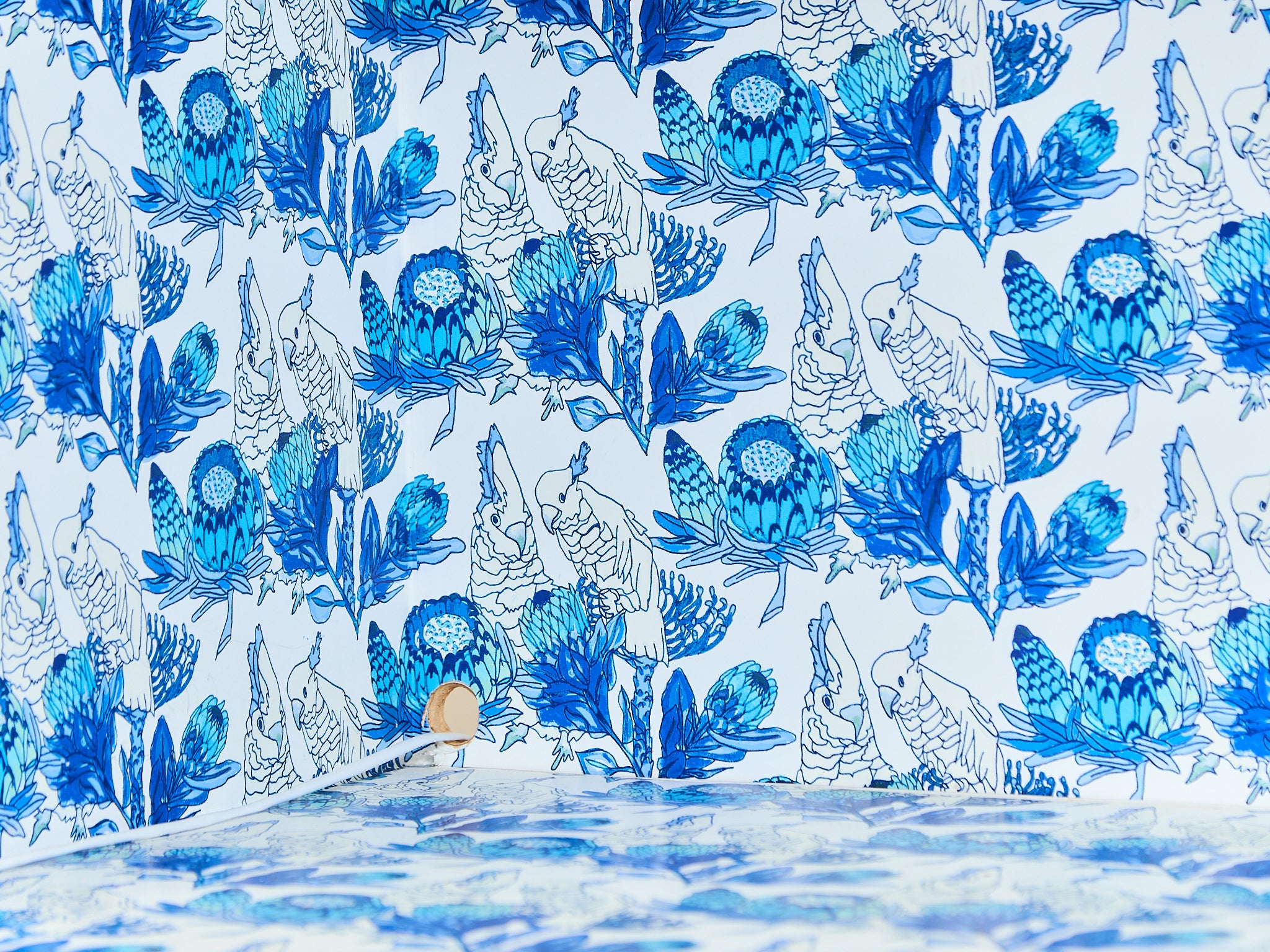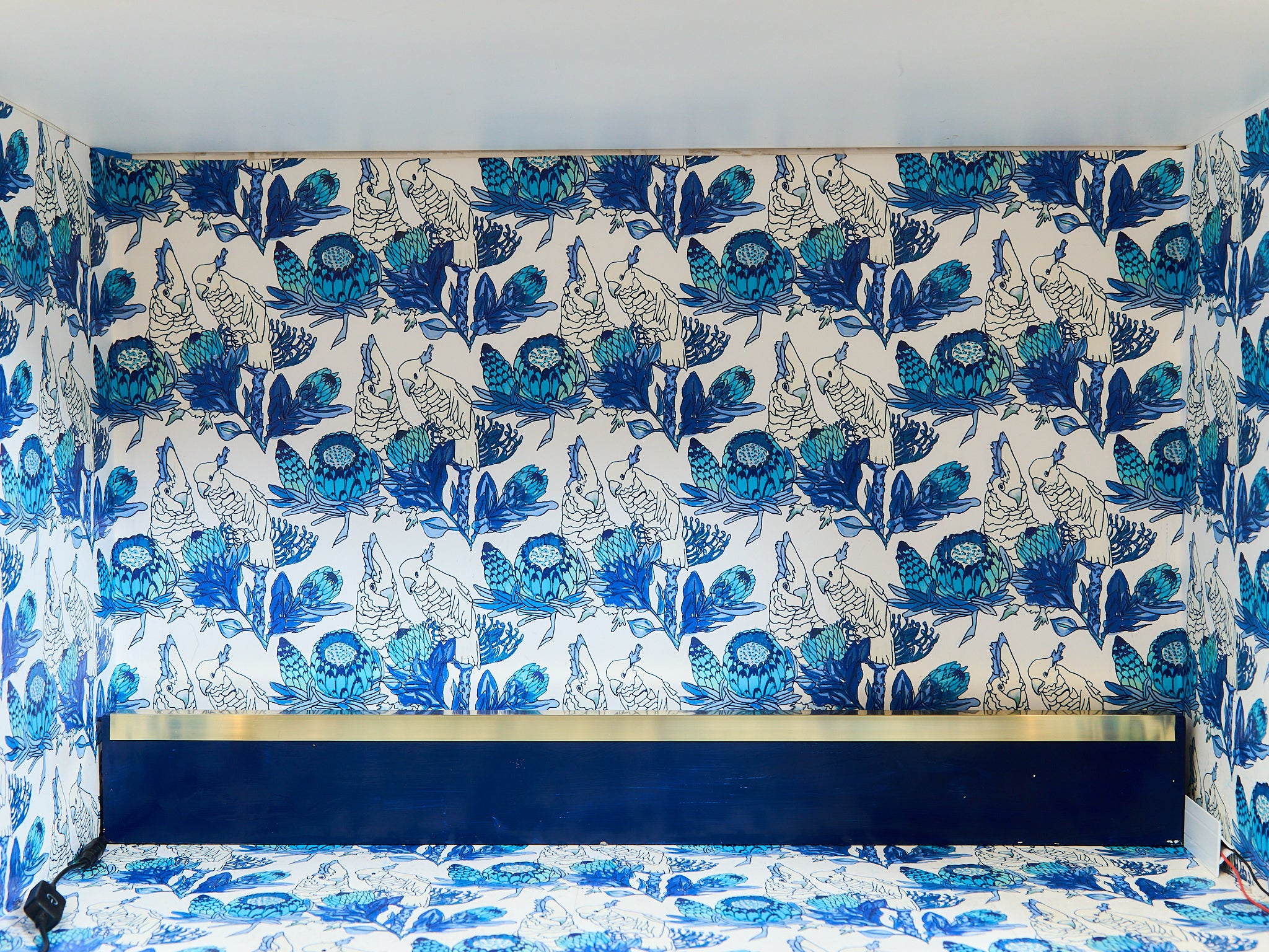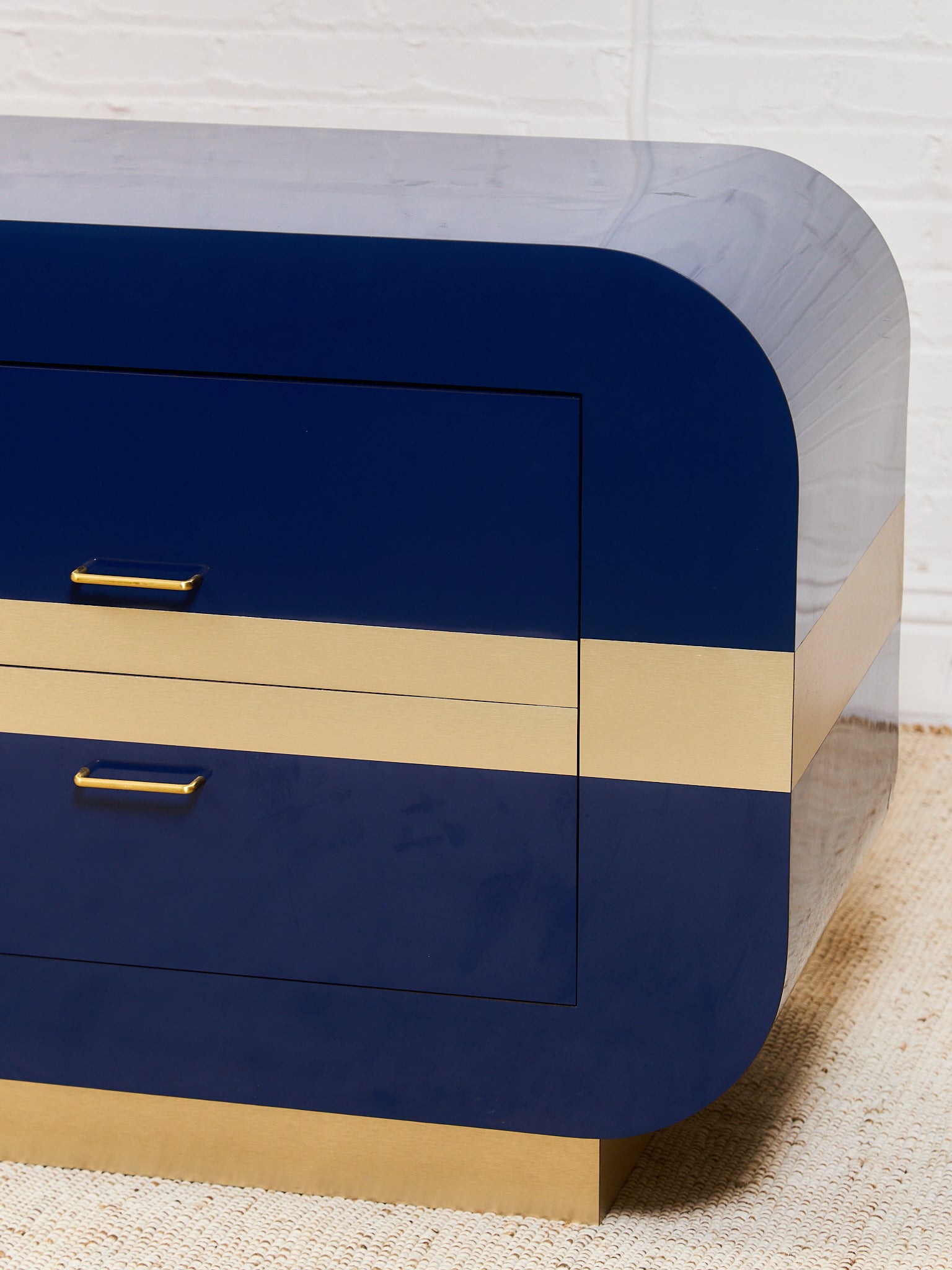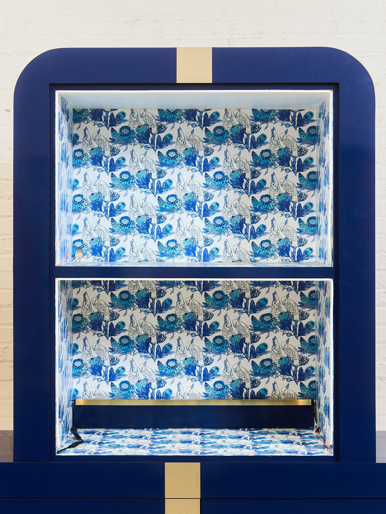 1970’s Italian 2 Piece Post Modern Blue and Gold Hutch with Plinth Base