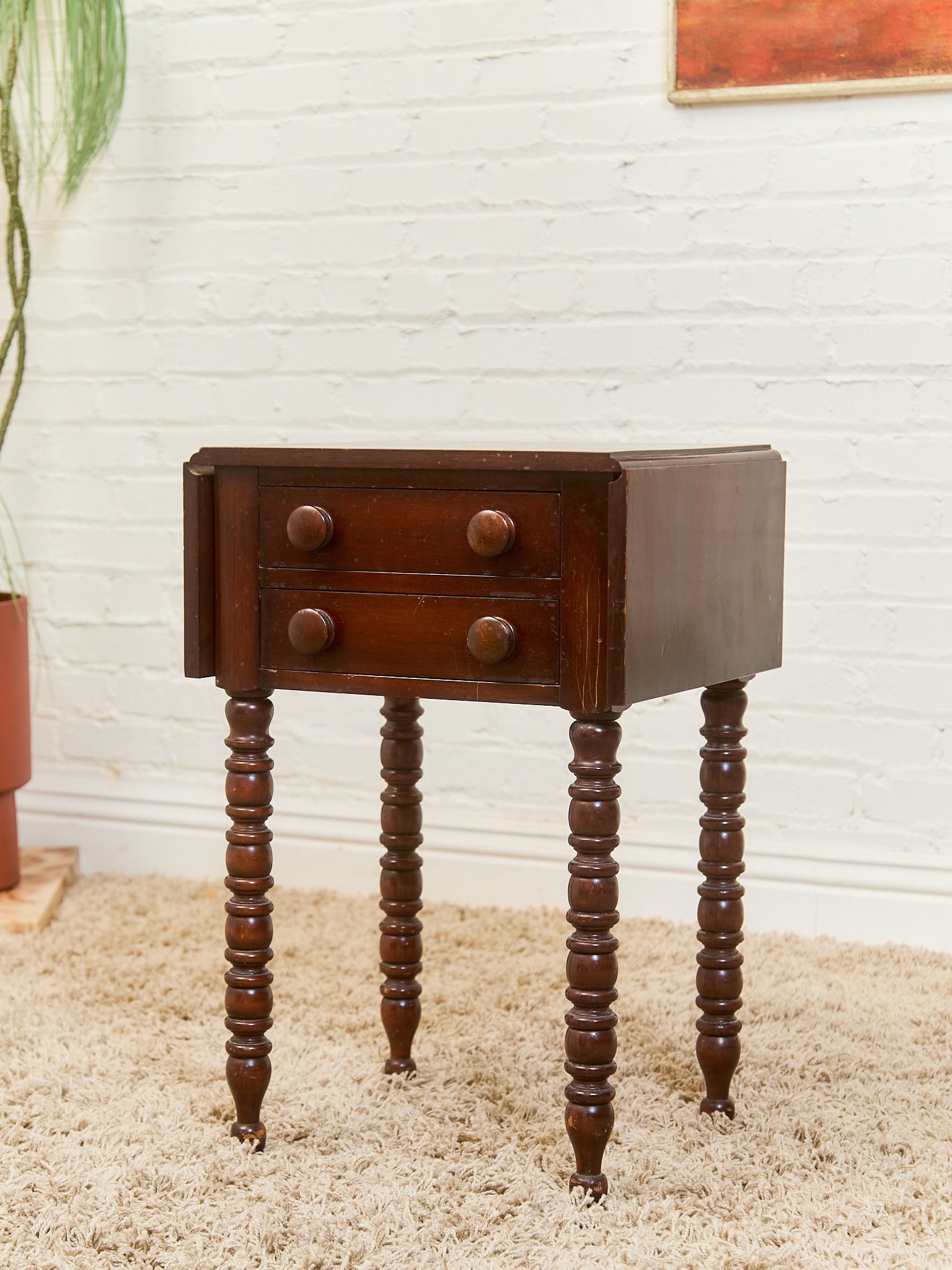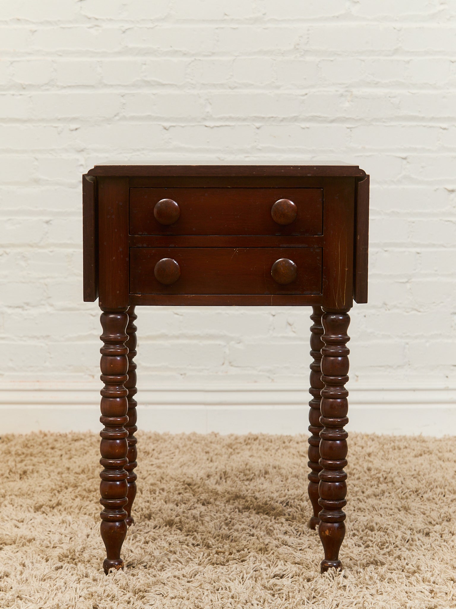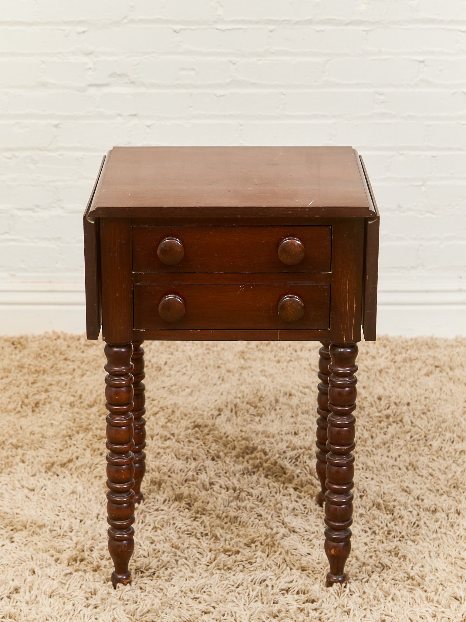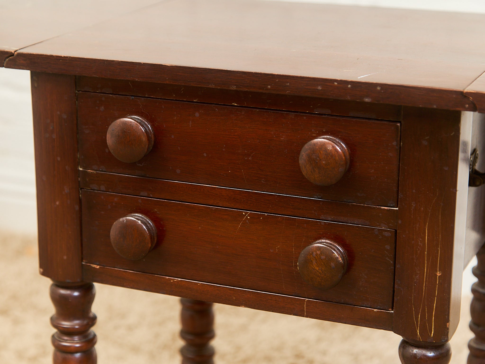 Antique Cherry Sheraton Side End Table Drop Leaf Drawers Bobbin Leg American Wild Cherry Cabinet Nightstand
