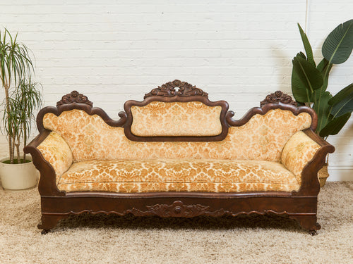 Edwardian Solid Walnut Frame Victorian Damask Gold Sofa