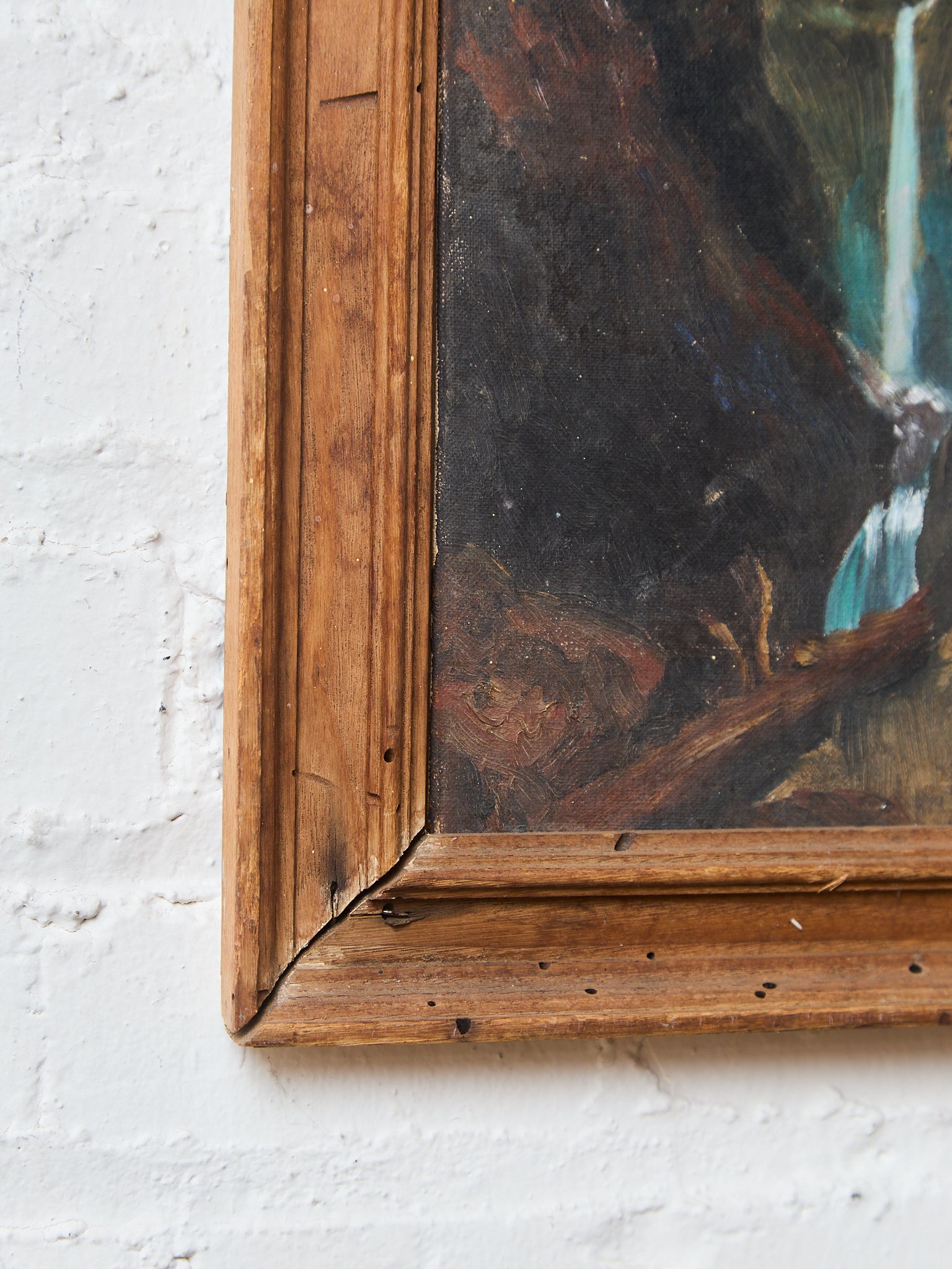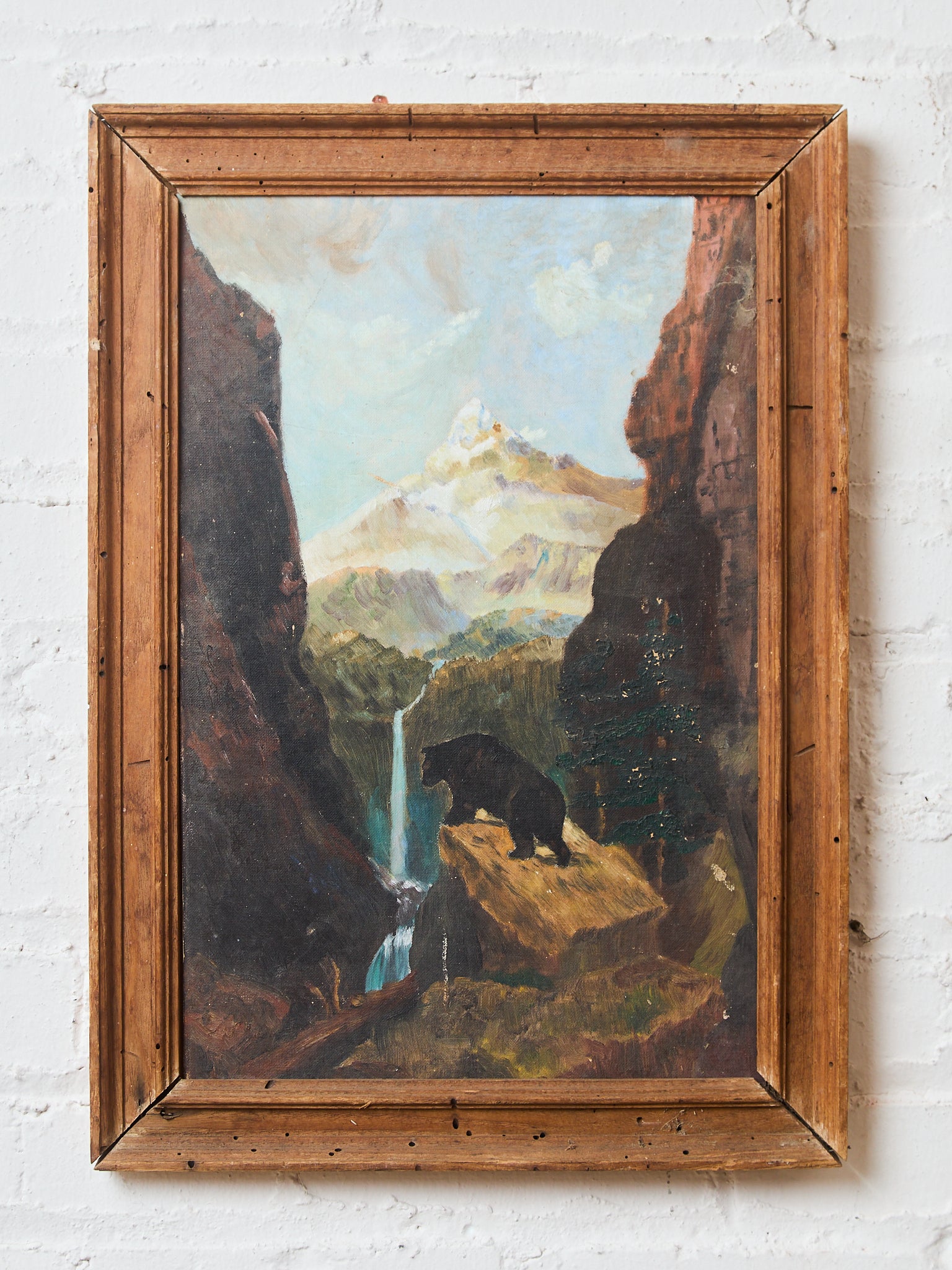 Moody Landscape Oil Painting with Mountain Waterfall and Bear
