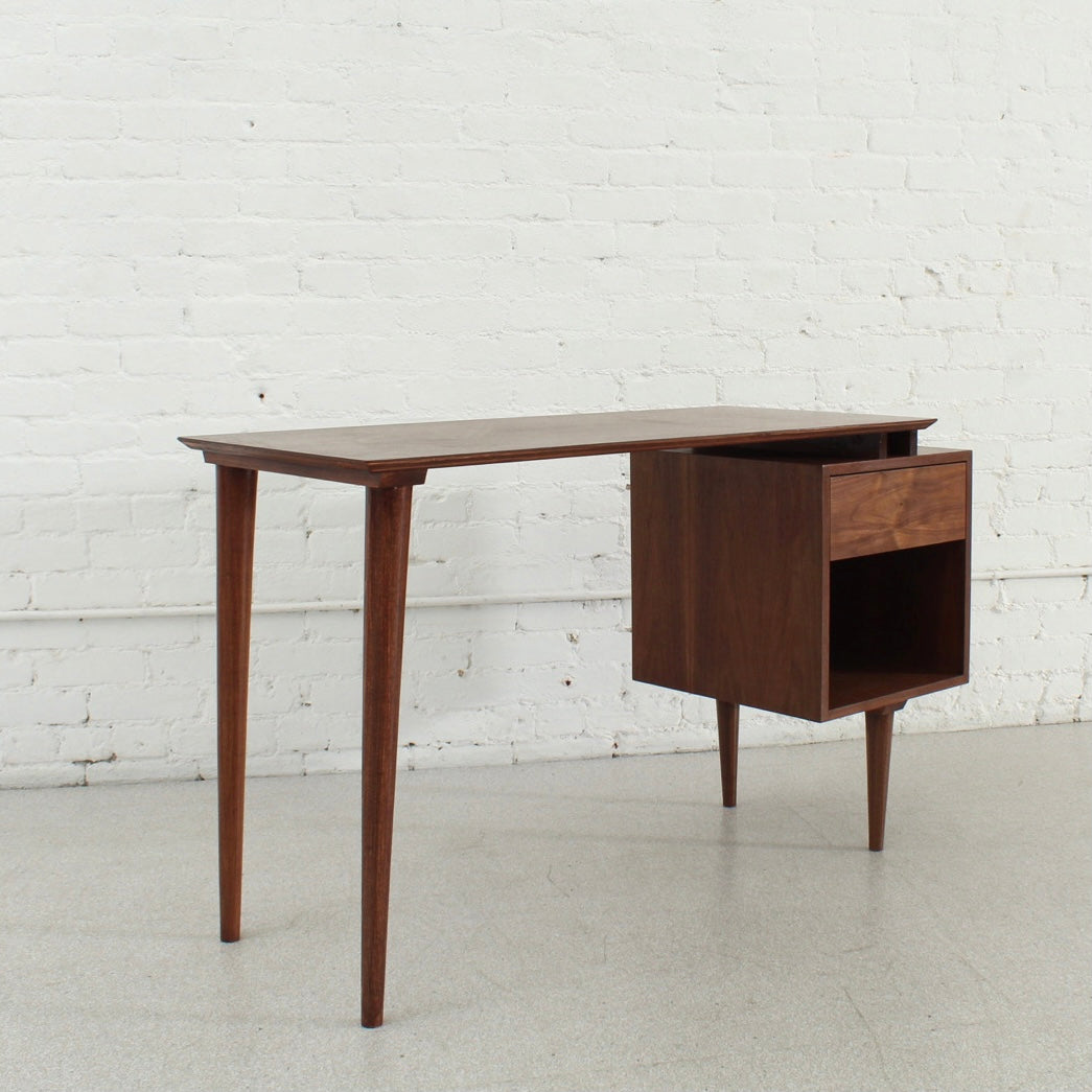 This Mid-century-inspired Sunbeam Exclusive Montgomery Desk has a silhouette that features a rectangle top with an open floating drawer shelf unit. Understated angled legs, compliment the beautiful grain of the wood without clashing or distracting, while sculpted drawer fronts add a layer of texture that draws the eye. Fall in love with your office space all over again with this exclusive piece handcrafted right here in Los Angeles, California!