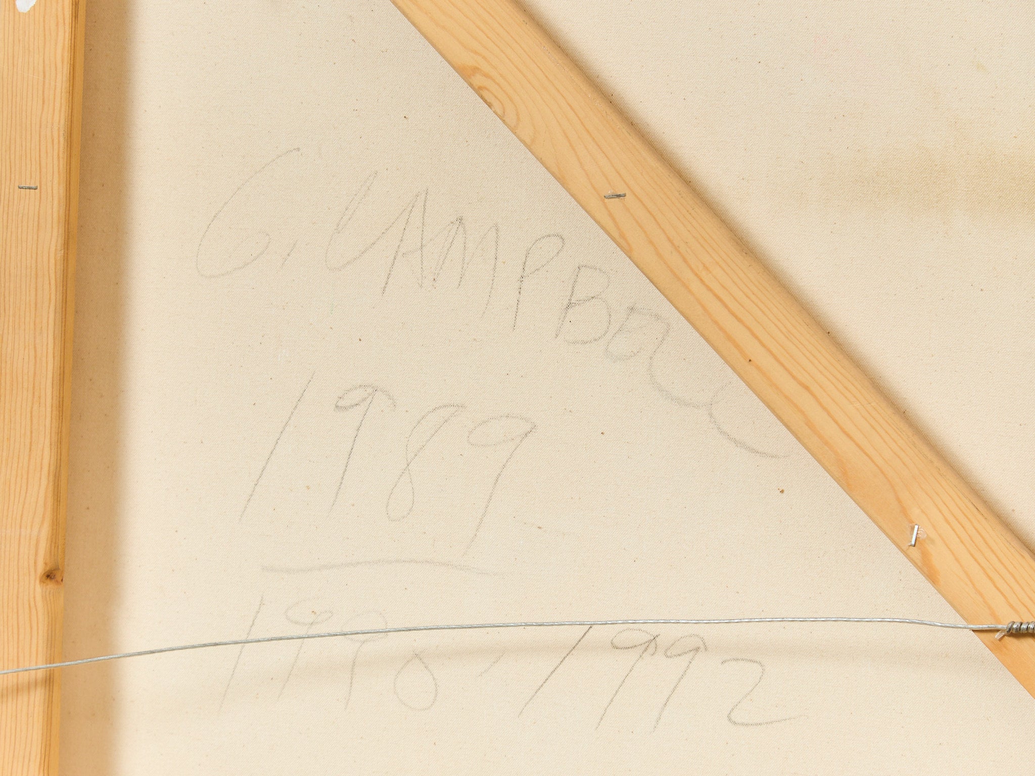 Acrylic painting of a stylized mandala in red by artist Gerald Campbell dating from the late 1980s-early 1990s. Campbell, a celebrated California artist, was well-known for his large abstracts that prompt the viewer's own interpretation.