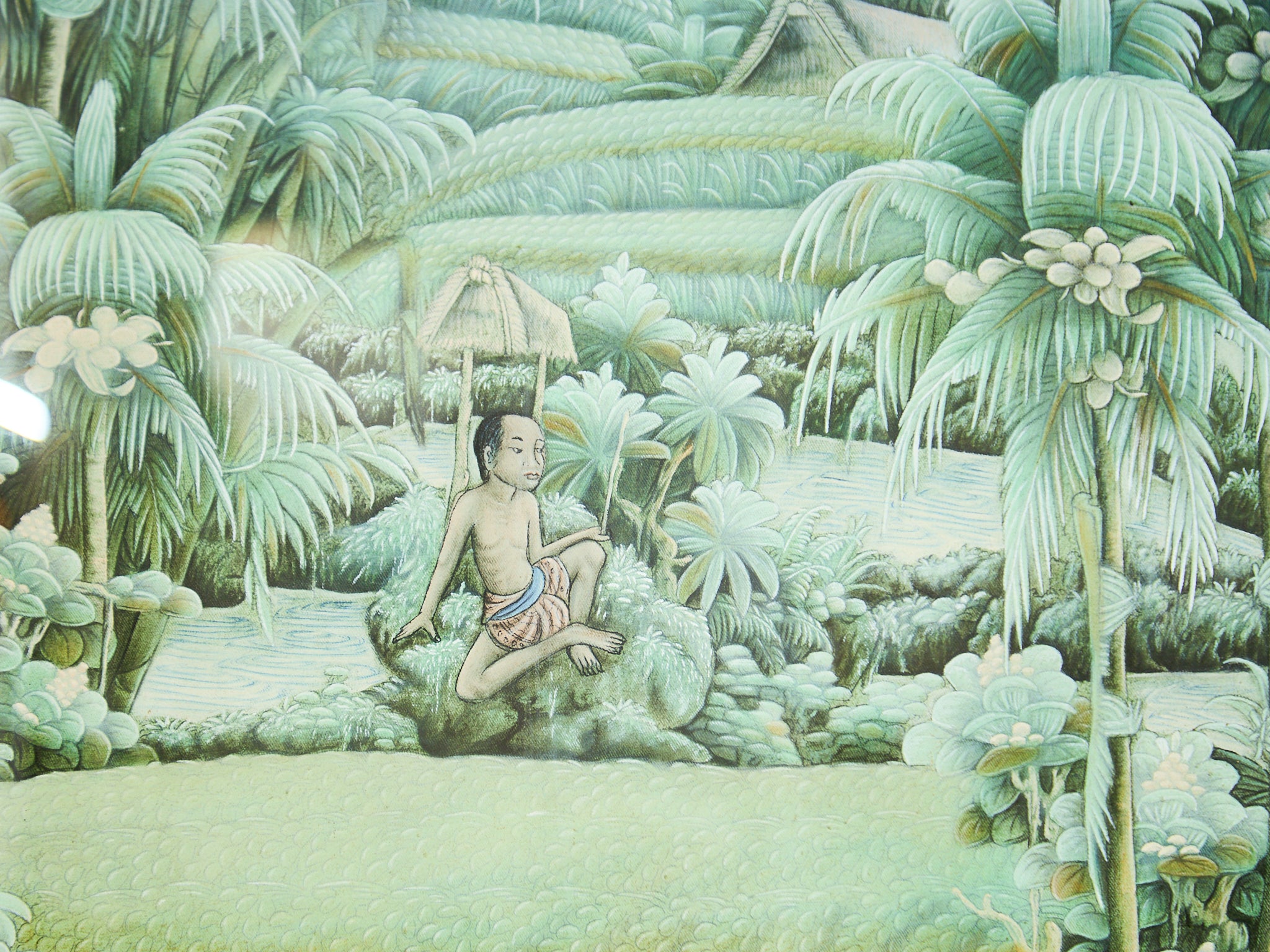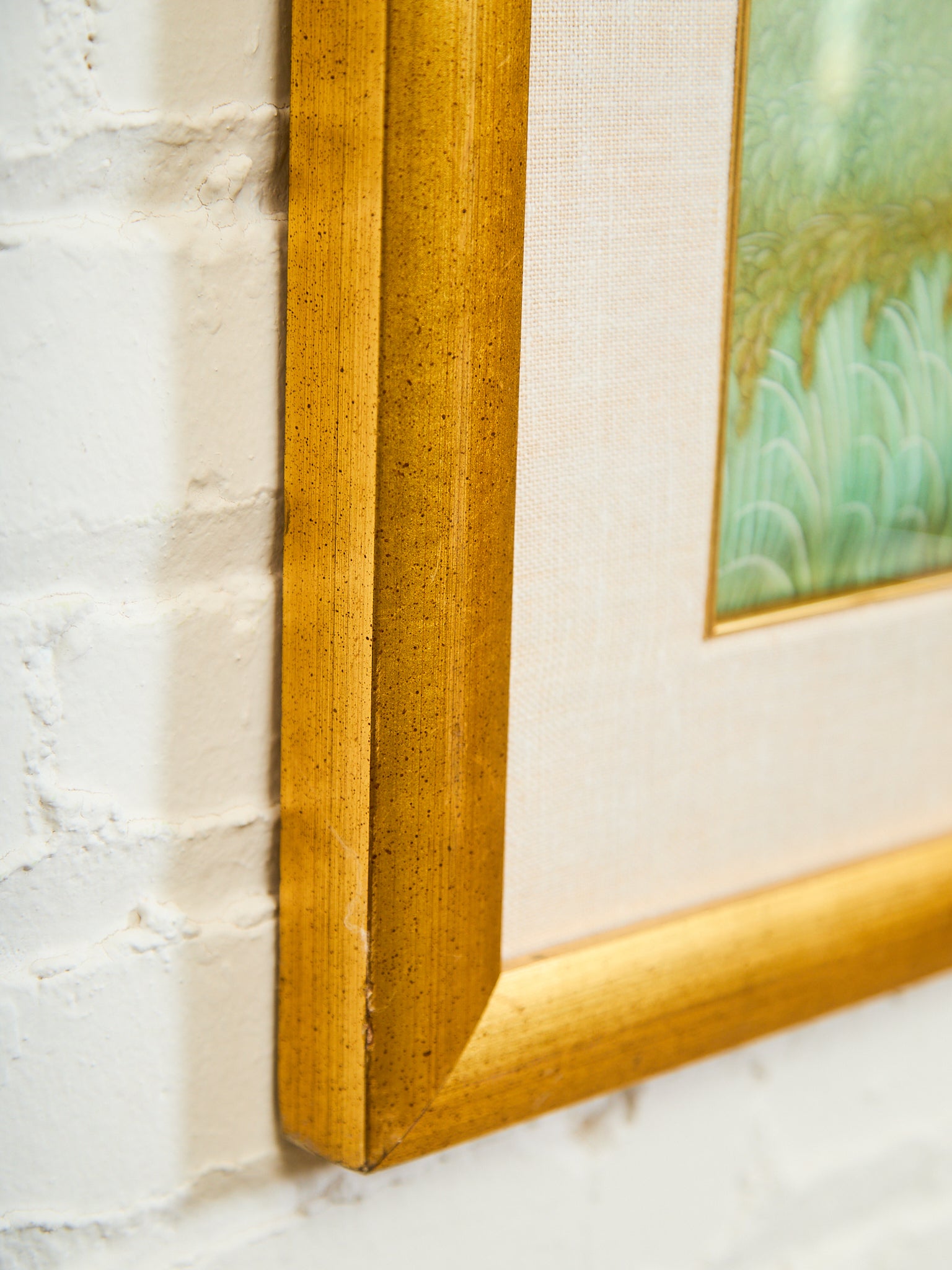 Framed Balinese Watercolor Painting of Rice Farmers on Silk